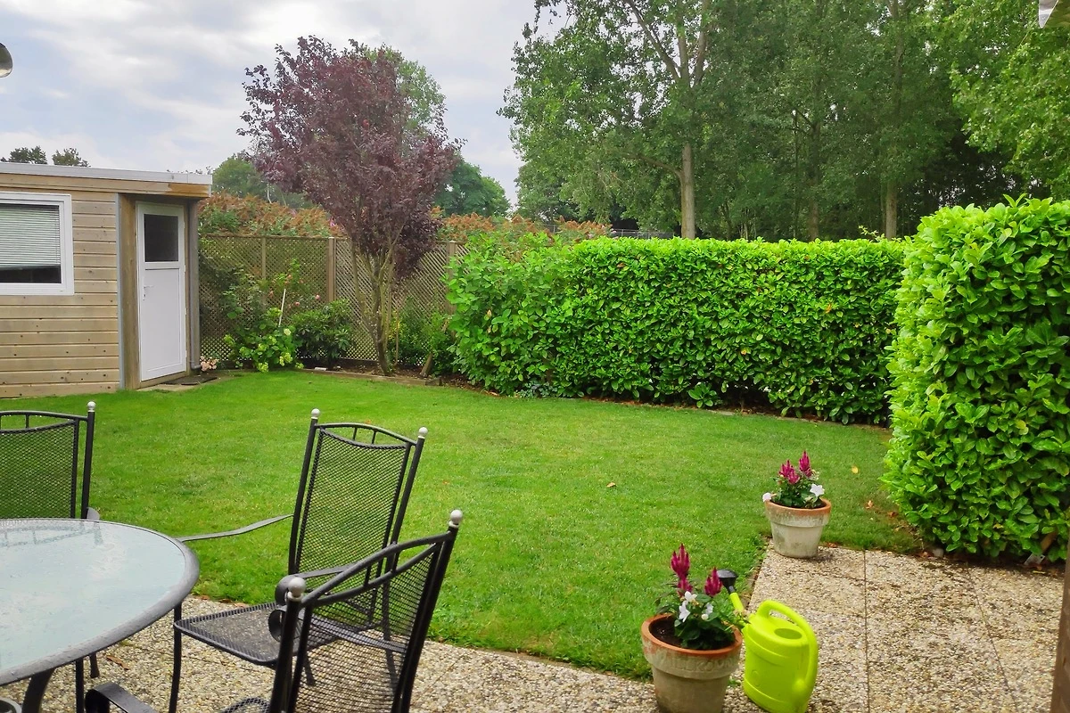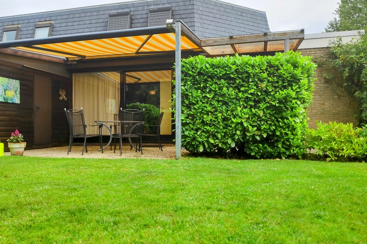 Die Terrasse des Gartens ist durch Kirschlorbeerbüsche und einem Schuppen windgeschützt und lädt unter einer elektrisch ausfahrbaren Markise zum verweilen ein.
