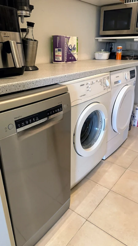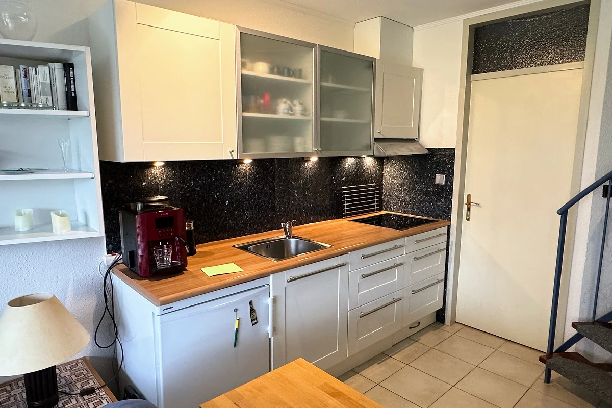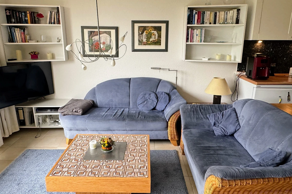 Die offene Küche ist komplett eingerichtet und bietet alles, was Sie für einen sorgenfreien Aufenthalt benötigen: Induktionskochfeld, Kühlschrank mit Gefrierfach, Wasserkocher und Kaffeevollautomat machen das Kochen zum Vergnügen. Im Wohnbereich sorgt ein TV für Unterhaltung, während das WLAN Ihnen jederzeit Konnektivität bietet.