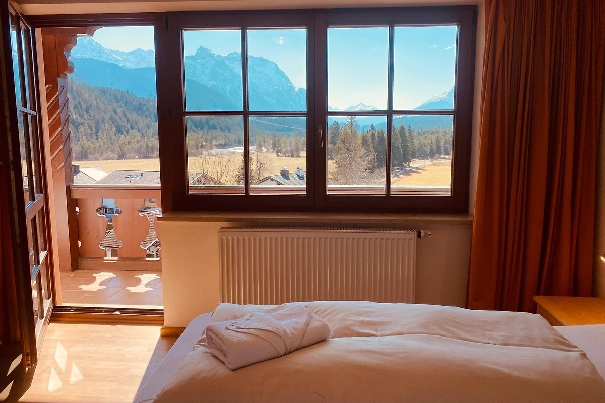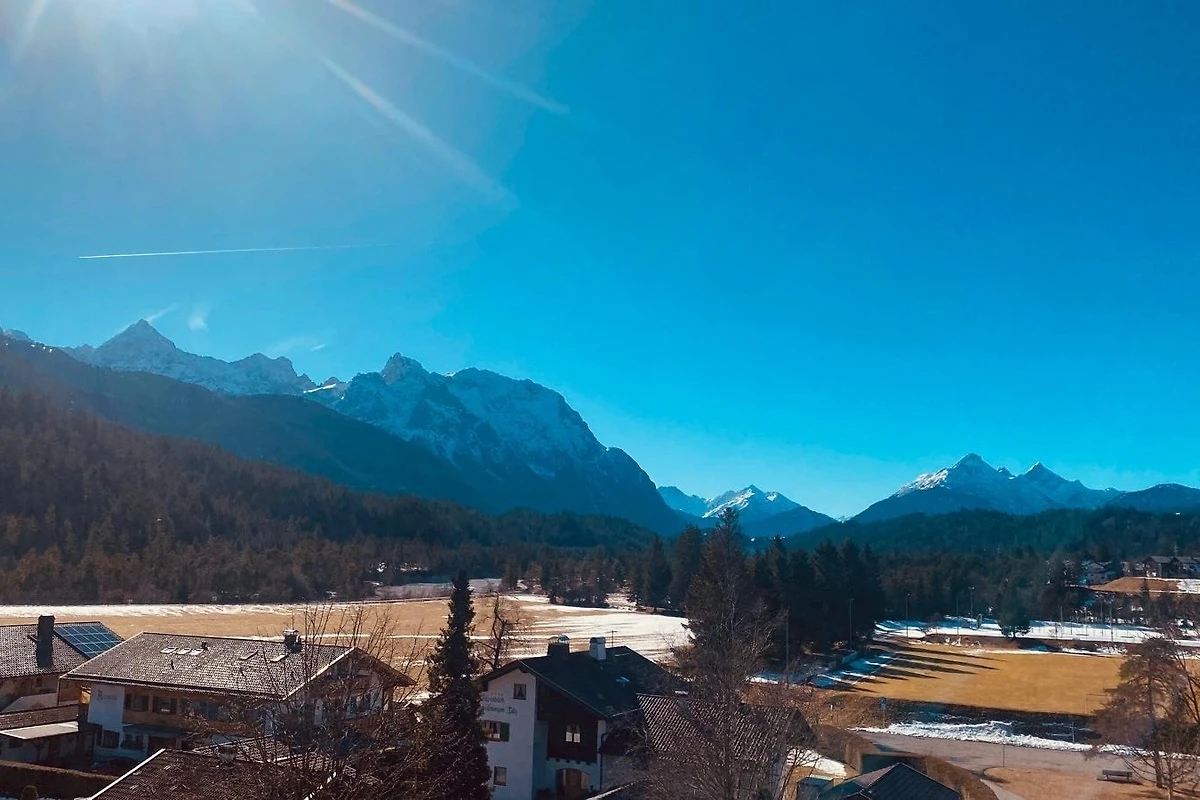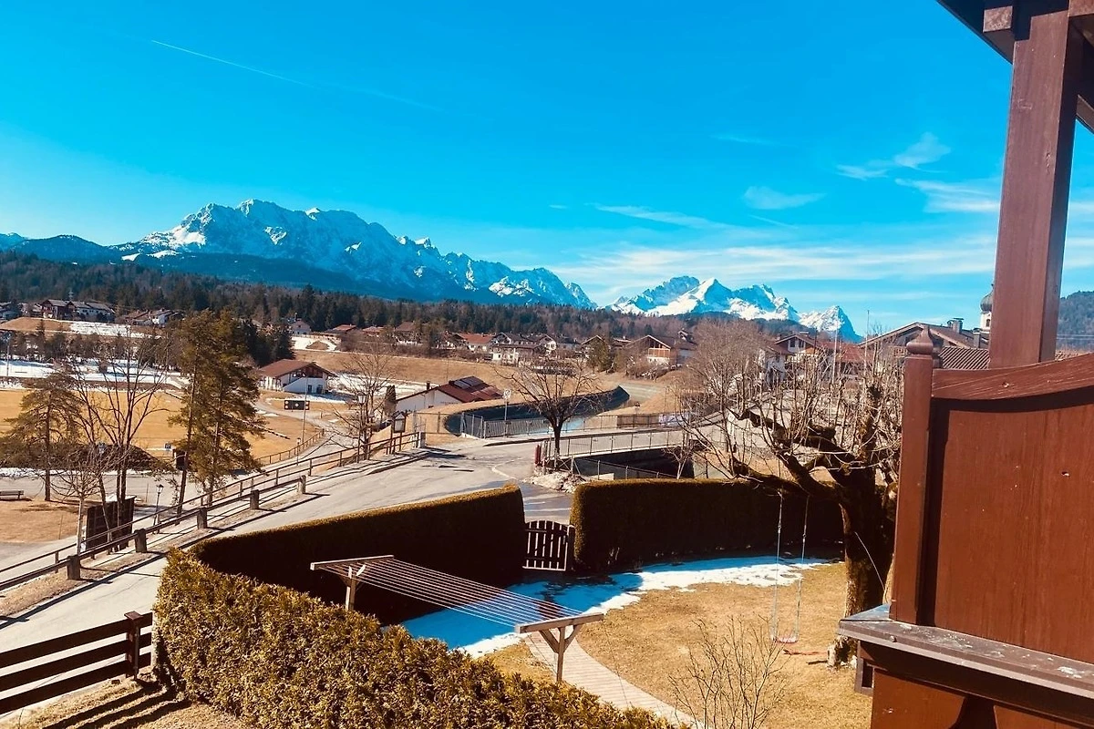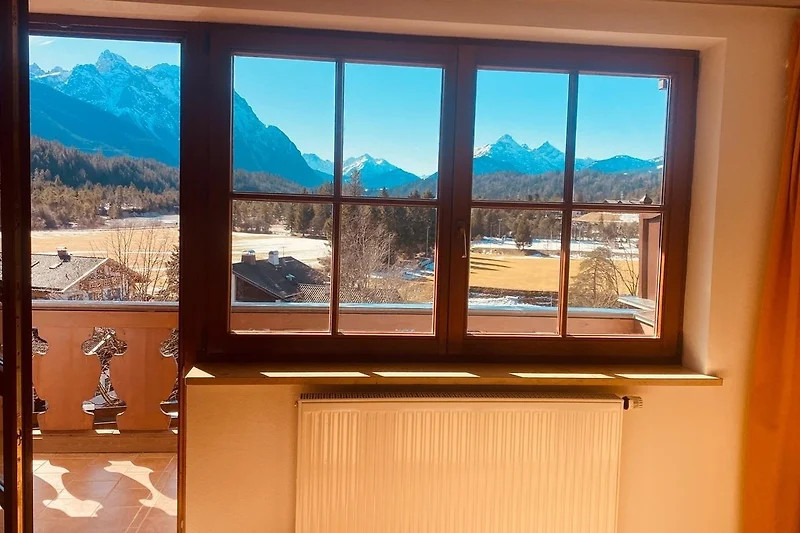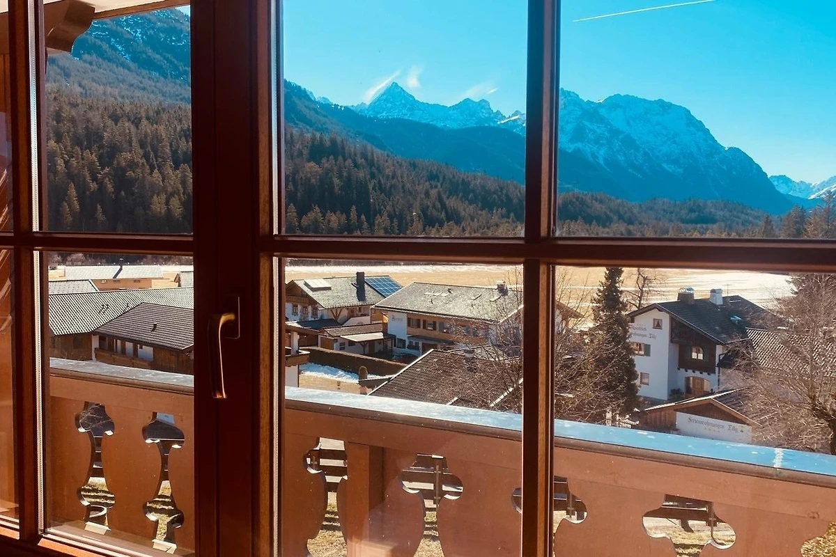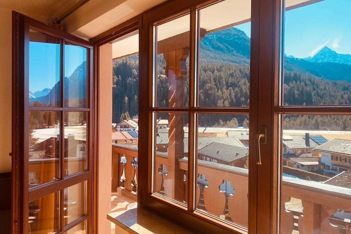 Ein sonniger Balkon für Frühstück mit Gipfelblick.