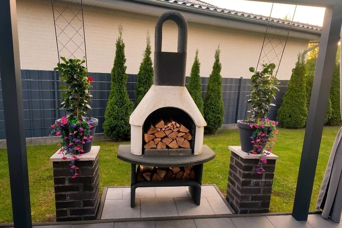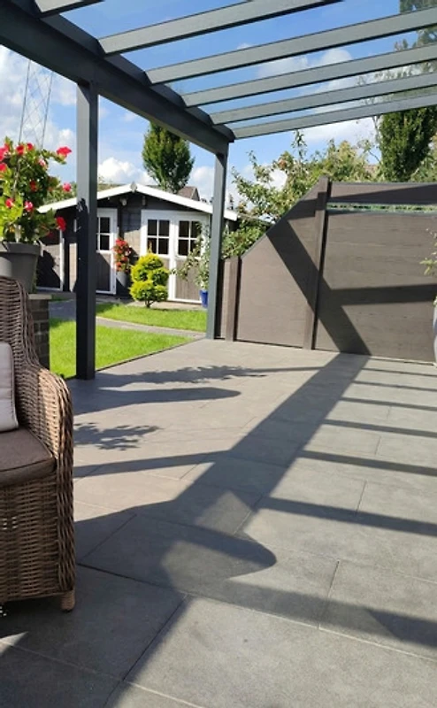 Ein Fahrradschuppen, sowie eine grosse überdachte Terrasse mit Grill und einem Gartenhäuschen für die Kinder.
