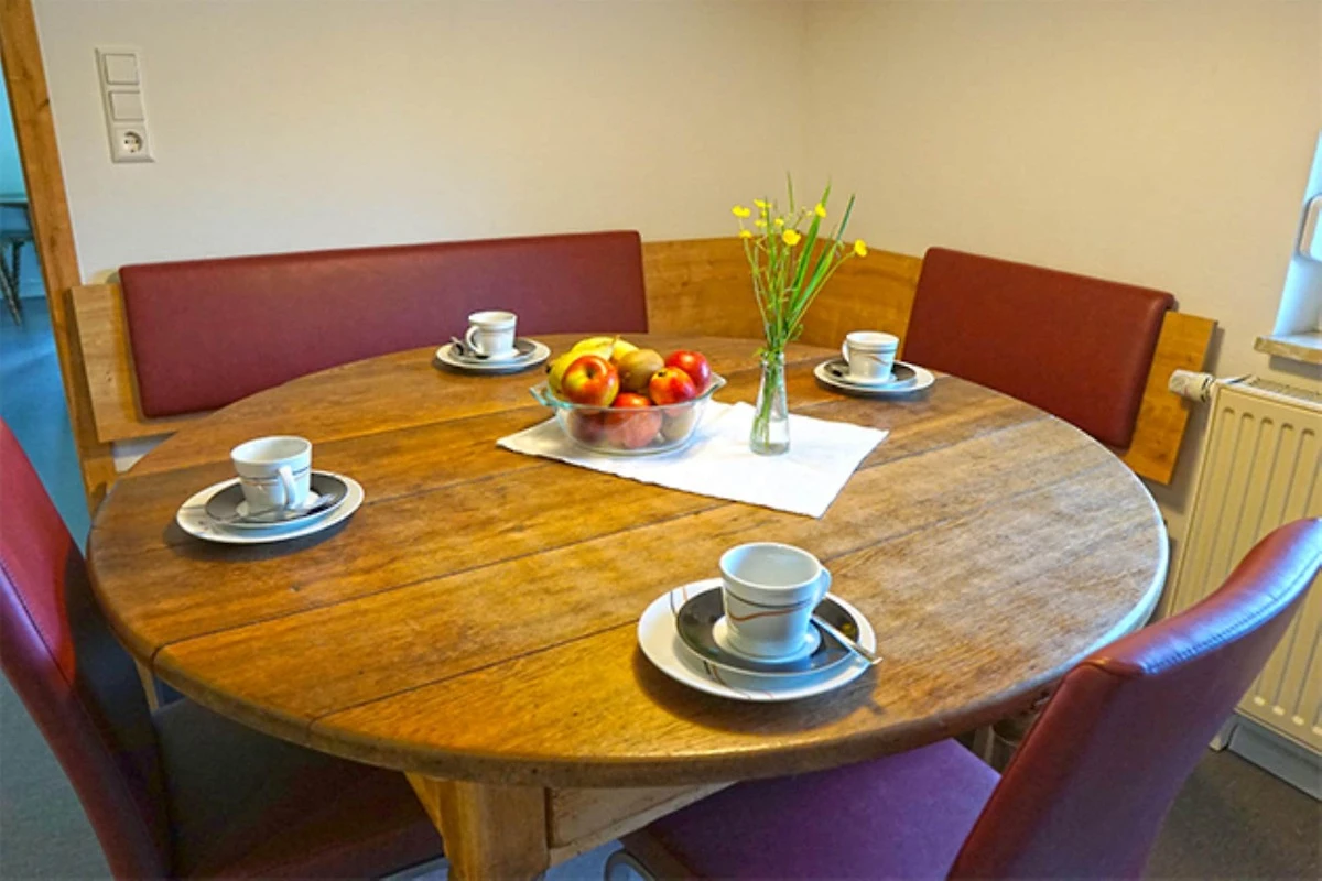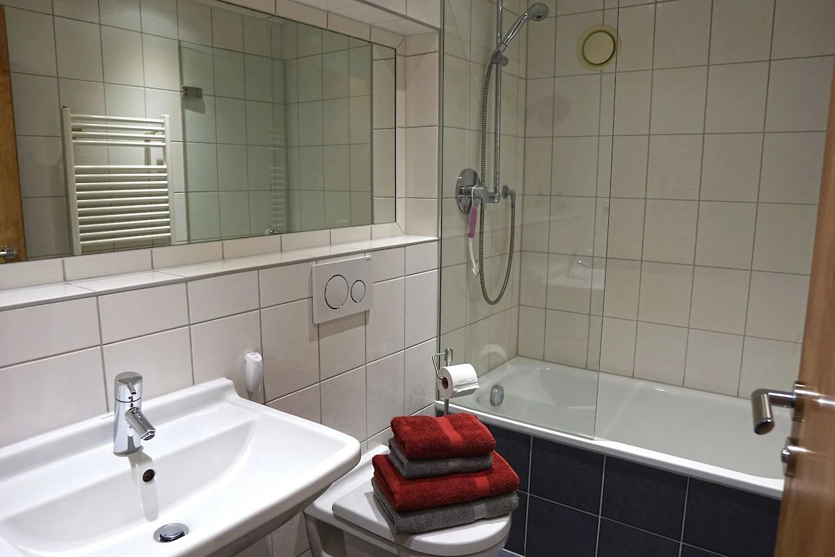 In der 1. Etage: (Wohnküche(Schlafcouch 1 Pers., TV, Esstisch, Toaster, Kochherd, Kaffeemaschine, Backofen, Mikrowelle, Spülmaschine, Kühlschrank), Schlafzimmer(Doppelbett), Schlafzimmer(Doppelbett oder 2 Einzelbetten), Badezimmer(Badewanne mit Dusche, Waschbecken, Toilette))