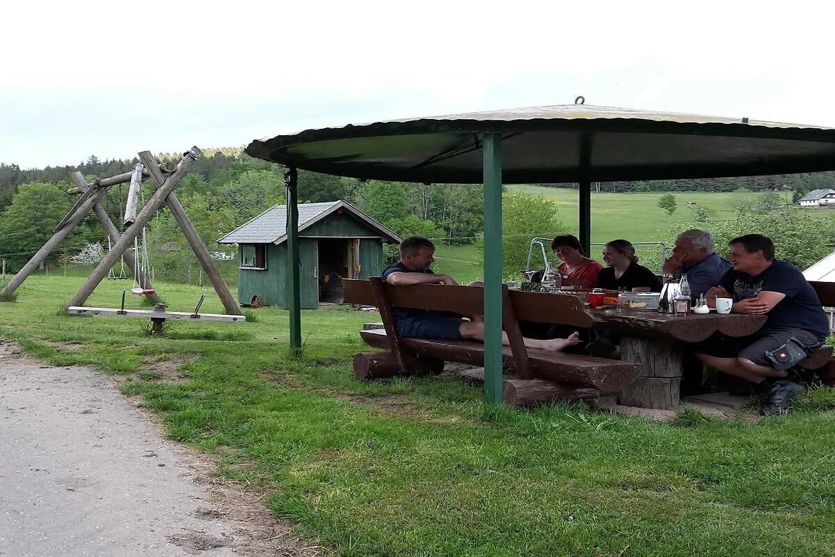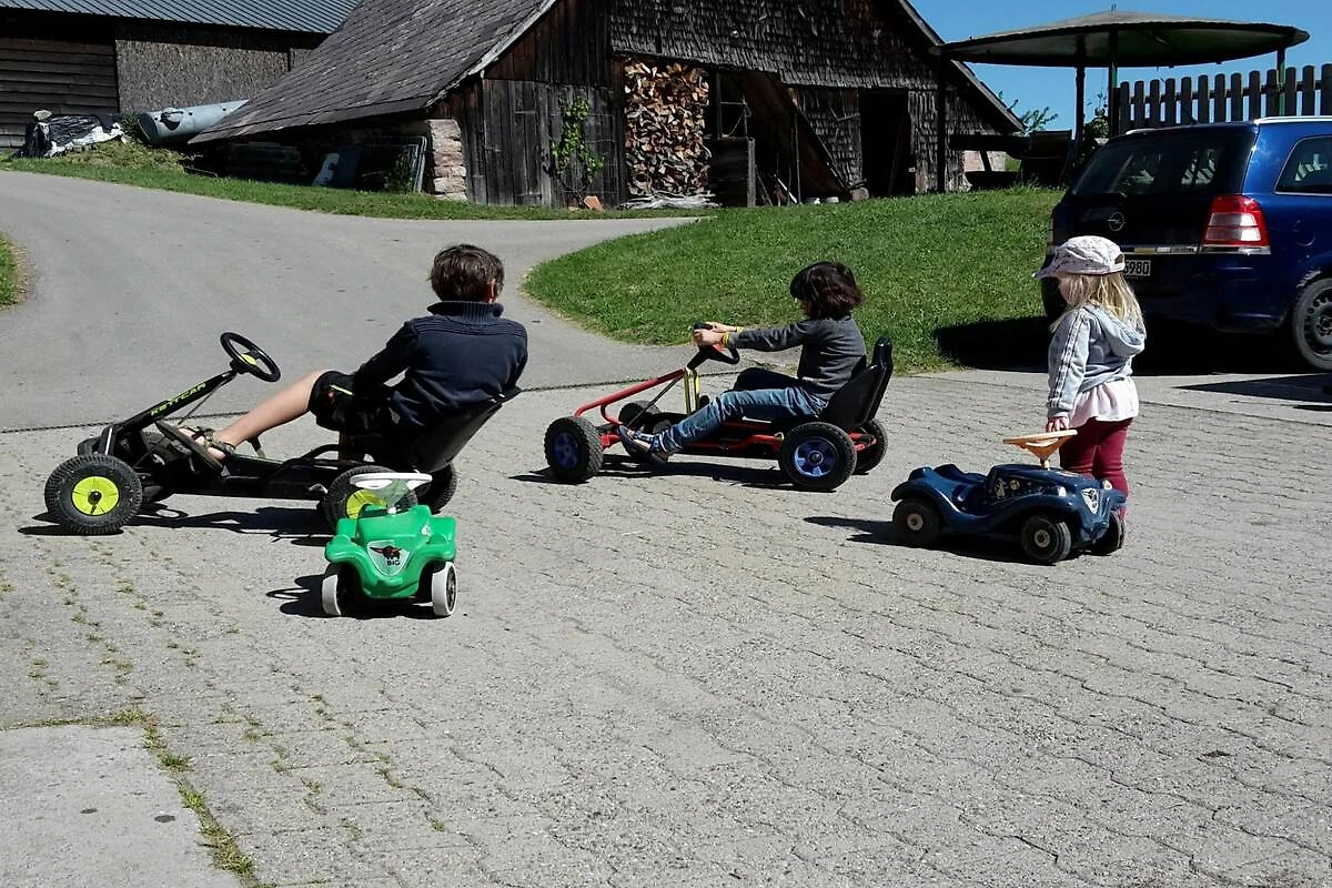 Auf dem Hof lädt eine Liegewiese mit Gartenmöbeln zum Verweilen ein. Außerdem gibt es eine Sitzgelegenheit mit Grill sowie einige Spielgeräte und Kinderfahrzeuge für die kleinen Gäste.