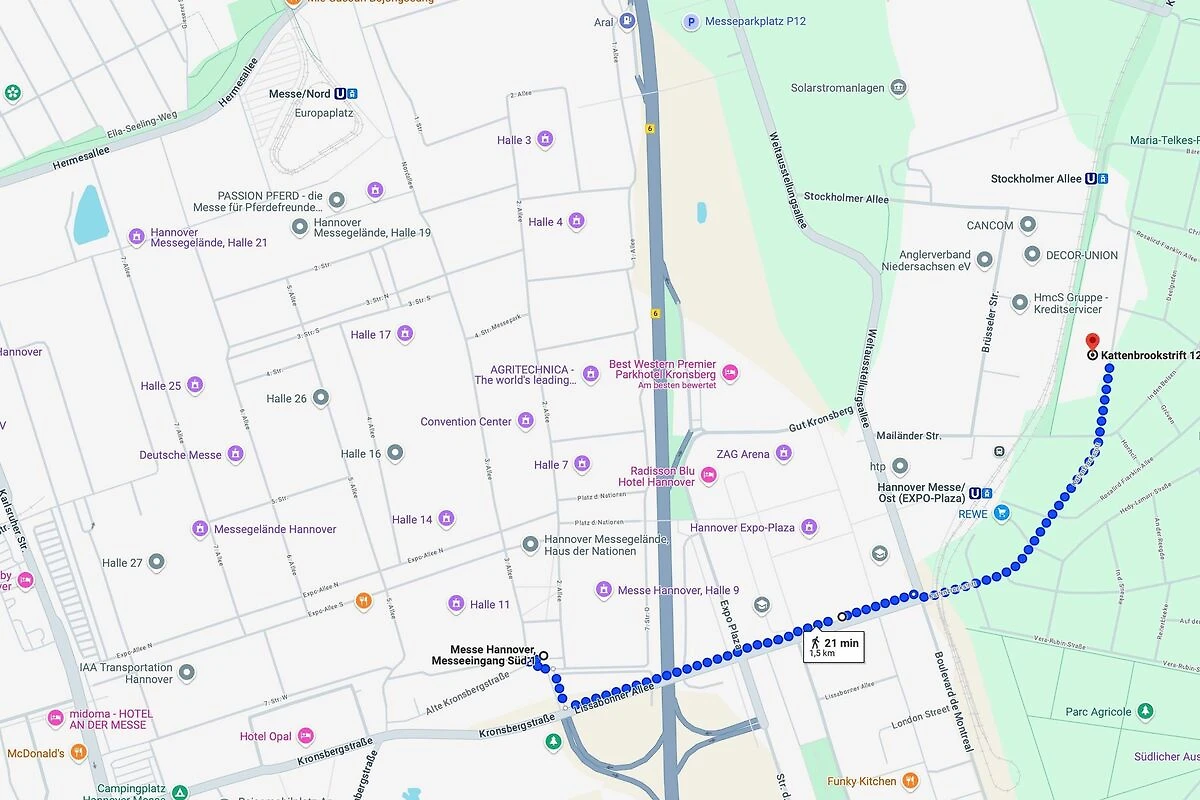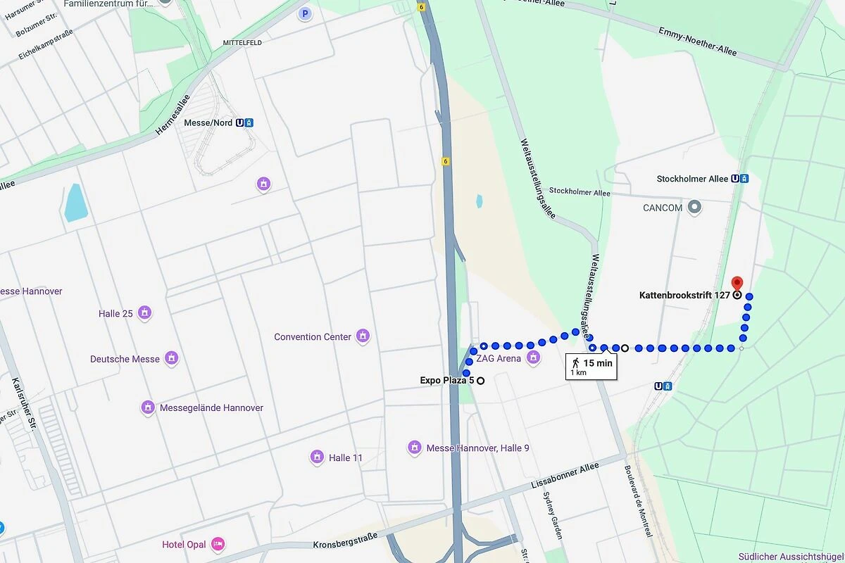 Die nächste Strassenbahnhaltestelle Stockholmer Allee (Linie 6) ist nur etwa 5 Minuten zu Fuss entfernt.