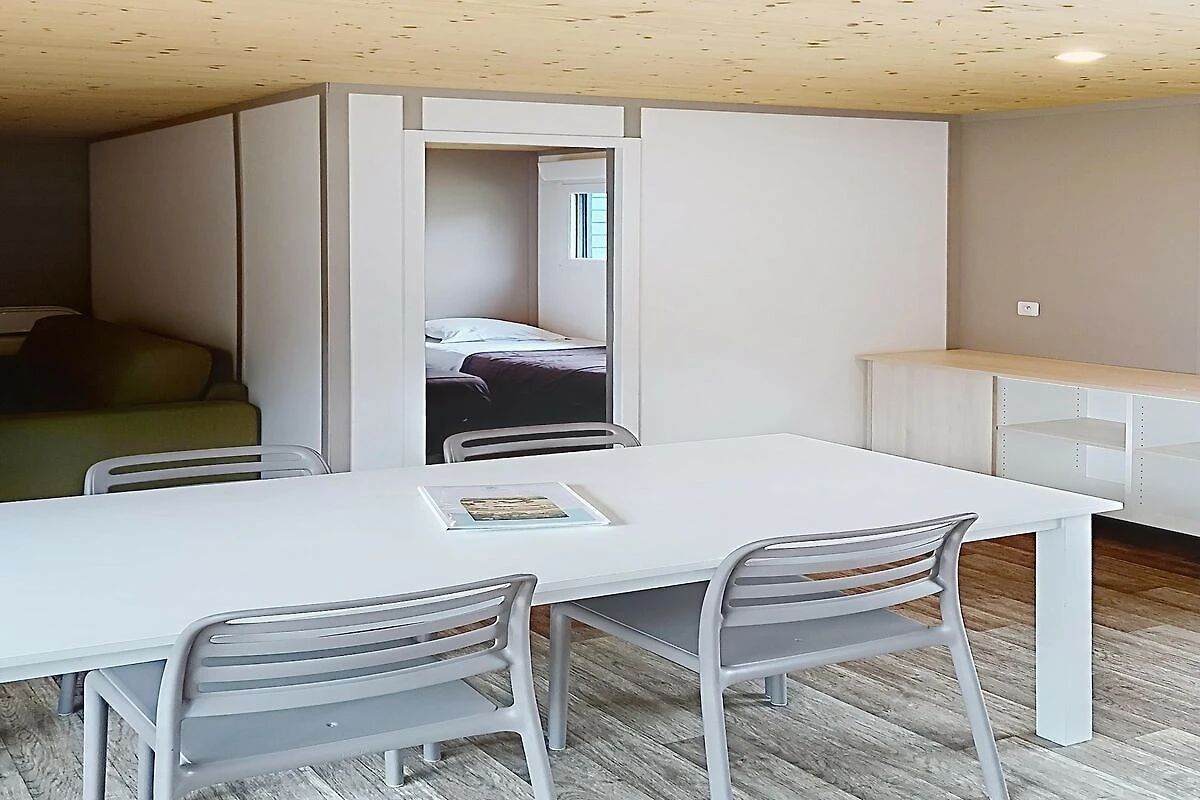 Die Inneneinrichtung ist speziell auf Bewegungsfreiheit und modernen Komfort ausgelegt. Das Ferienhaus verfügt über zwei komfortable Schlafzimmer – eines mit einem bequemen Doppelbett und das andere mit zwei Einzelbetten – sowie ein Doppelschlafsofa im Wohnbereich für zusätzliche Flexibilität. Ein besonderes Highlight ist die barrierefreie, tiefergelegte Küche mit Glaskeramikkochfeld, Geschirrspüler und Mikrowelle. Auch das Badezimmer ist durchdacht gestaltet und bietet eine ebenerdige Dusche, ein tiefergelegtes Waschbecken und ein separates, erhöhtes WC für einen stressfreien Aufenthalt, insbesondere für Gäste mit eingeschränkter Mobilität.