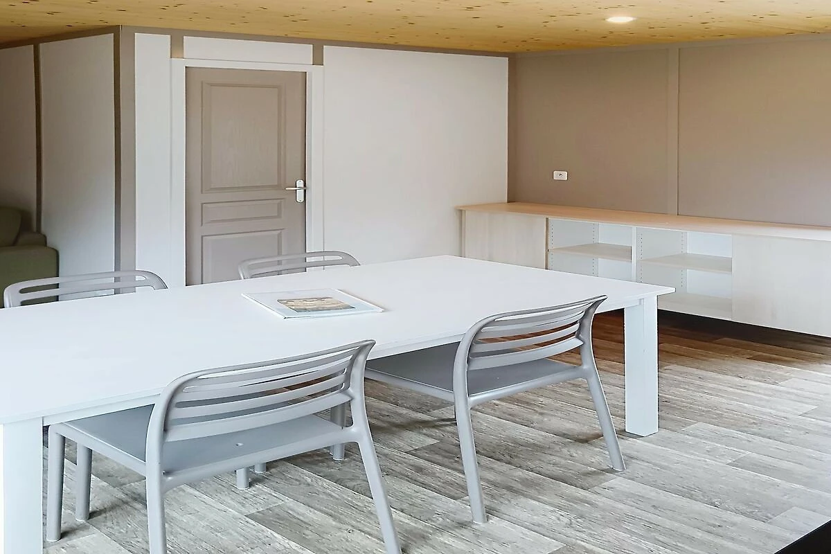 Große Türen führen auf eine private Terrasse mit Gartenmöbeln – der perfekte Ort, um im Freien zu essen oder zu entspannen und den Ausblick zu genießen. Die Lage im Freien verstärkt das Gefühl von Weite und Naturverbundenheit.