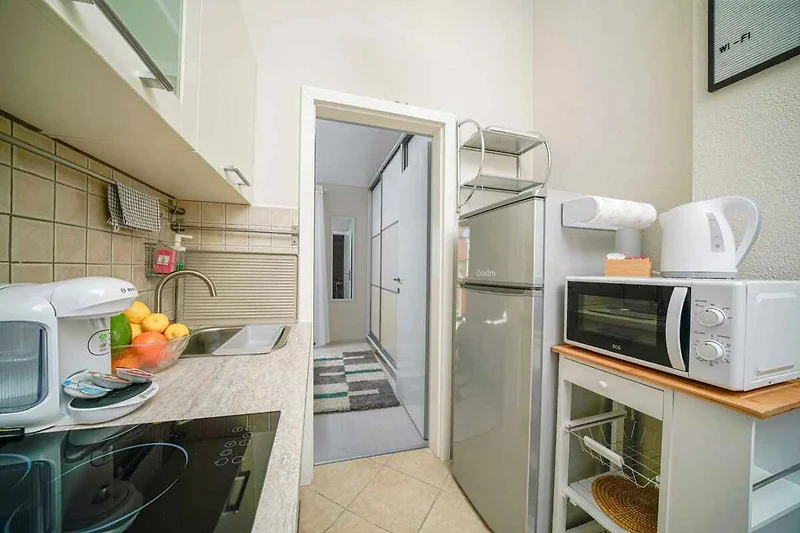Der Eingang in Ihre Ferienwohnung führt direkt in den Vorraum. Küche mit Klimaanlage, Essecke, Elektroherd (Induktionsherd, Cerankochfeld), Kühlschrank, Mikrowelle, Kaffeemaschine und elektrischem Wasserkocher. Wohn/Schlafzimmer mit 1 Zusatzbett auf Doppelausziehcouch, Sitzecke, TV und Klimaanlage. Schlafzimmer mit 1 Doppelbett (Kingsize). Bad mit Dusche und WC.