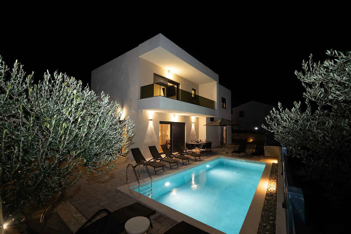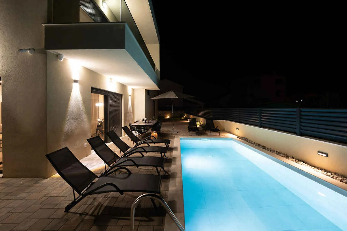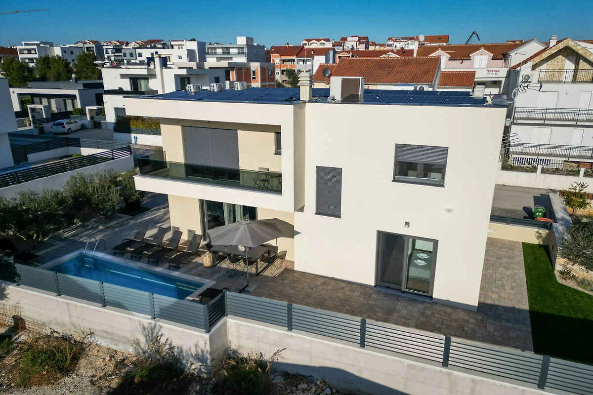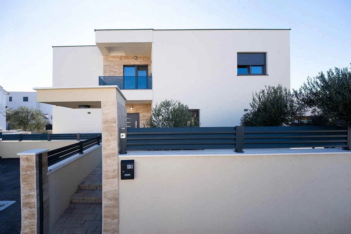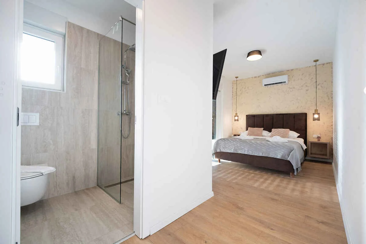 Der Eingang in Ihre Villa ist ebenerdig und führt direkt in den Flur. Aufenthaltsraum mit Sitzecke, TV, Essecke und Zugang zur Terrasse. 4 Schlafzimmer jeweils mit 1 Doppelbett (Kingsize). Küche mit Klimaanlage, Essecke, Elektroherd (Induktionsherd), Backofen, Dunstabzugshaube, Geschirrspüler, Kühlschrank (Eisfach), Mikrowelle, Kaffeemaschine, elektrischem Wasserkocher und Zugang zur Terrasse. Abstellraum im Flur mit soba sa perilicom i sušilicom za robu. Bad mit Dusche, WC und privatna u sklopu spavaće sobe. 2 Bäder jeweils mit Dusche und WC.