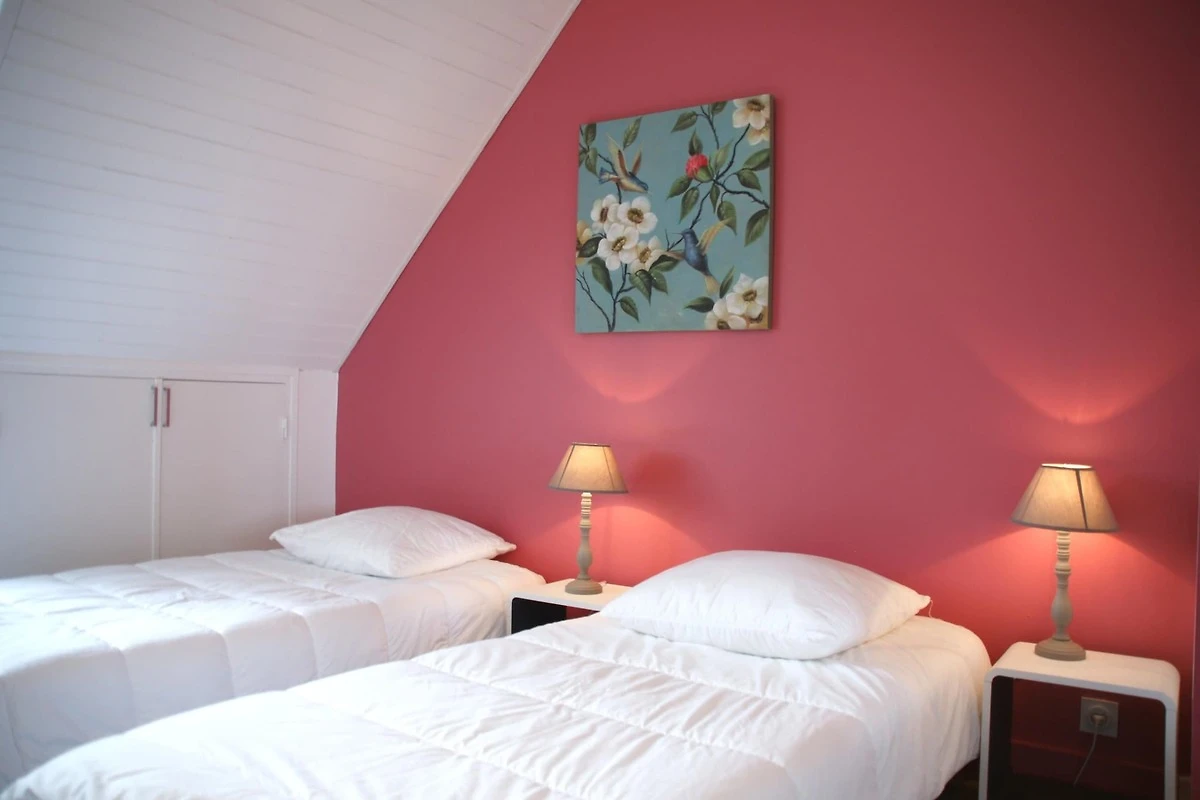 Im Obergeschoss befinden sich drei weitere Schlafzimmer: eines mit einem Doppelbett (160 cm), eines mit einem Doppelbett (140 cm) und eines mit zwei Einzelbetten (90 cm). Ein zweites Badezimmer mit Badewanne und separatem WC vervollständigen das Angebot.