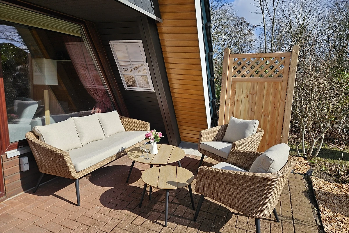 Genießen Sie sonnige Stunden im eigenen Garten. Auf der Terrasse laden Tisch und Stühle zum draußen Essen ein, sowie eine gemütliche Sitzgruppe mit schönen Loungemöbeln.