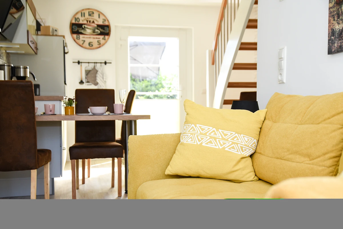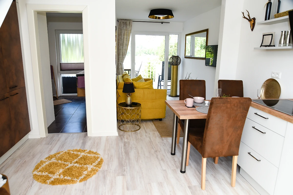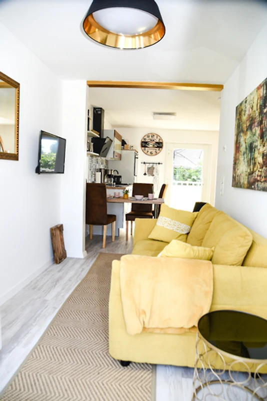 Die offen gestaltete Küche ist mit einer Küchenzeile, Geschirrspüler, Wasserkocher und Kaffeemaschine ausgestattet. Gemeinsame Mahlzeiten lassen sich am Esstisch genießen, während die stilvolle Einrichtung mit liebevollen Details wie Zimmerpflanzen und modernen Bildern für eine angenehme Atmosphäre sorgt. Bettwäsche und Handtücher sind inklusive.