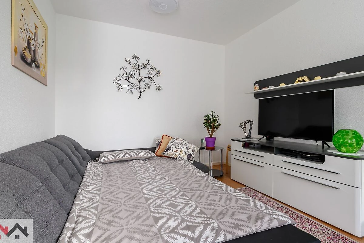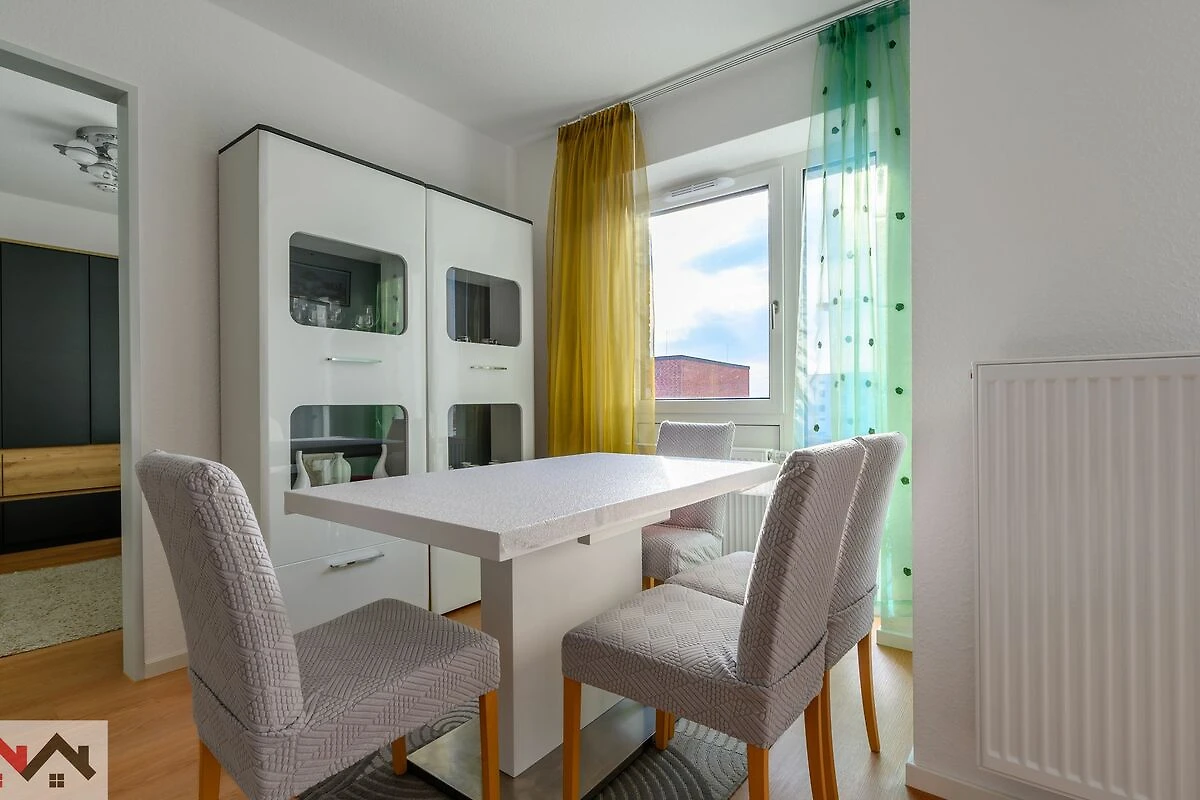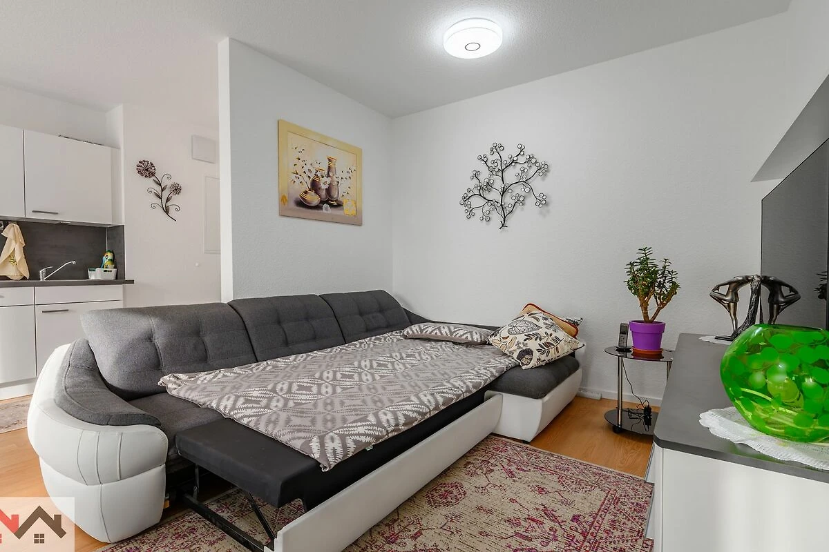 Wohn- und Essbereich: Ein offenes Konzept verbindet den Wohnbereich mit einer modernen Küche. Die TV-Ecke mit einem bequemen Sofa (umwandelbar zu einem Bett) lädt zu gemütlichen Abenden ein.