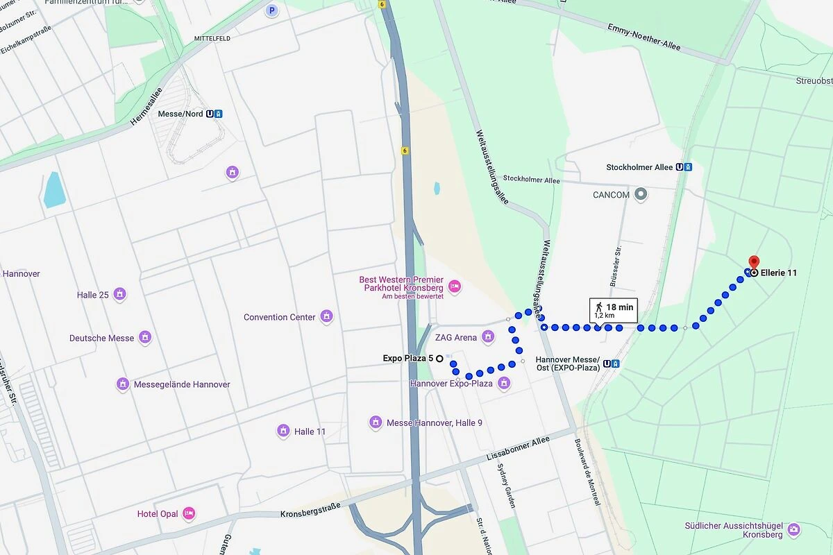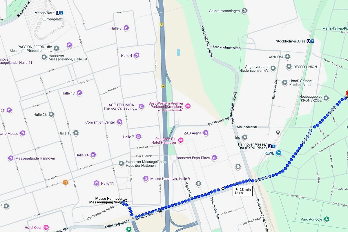 Kronsrode ist ein neuer und moderner Stadtteil im Südosten von Hannover, der besonders durch seine ruhige Wohnlage und die gute Anbindung an das Messegelände überzeugt. Die Umgebung ist gepflegt, familienfreundlich und bietet eine angenehme Mischung aus Wohnkomfort, Grünflächen und guter Infrastruktur. Die nächste Strassenbahnhaltestelle (Stockholmer Allee, Linie 6) ist nur 450 Meter entfernt. Von dort ist es nur eine Haltestelle bis zur Messe/Ost (EXPO-Plaza).
