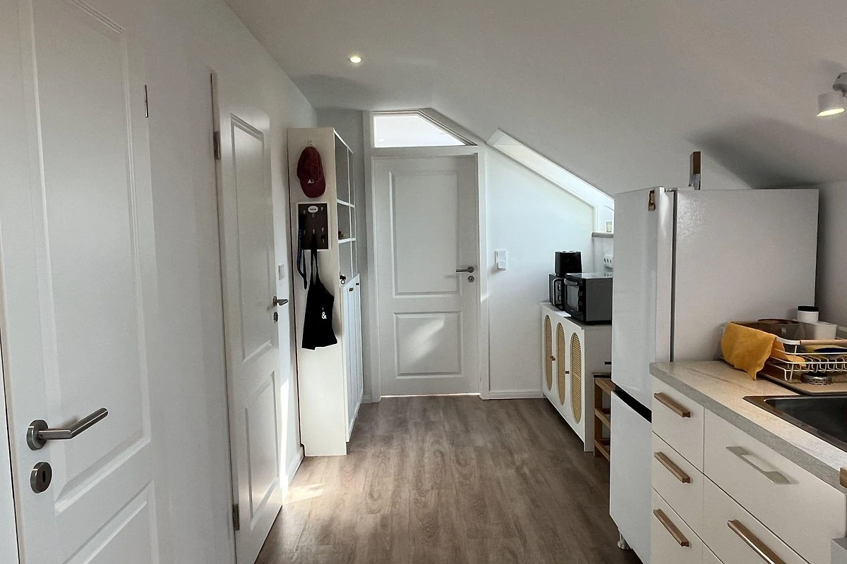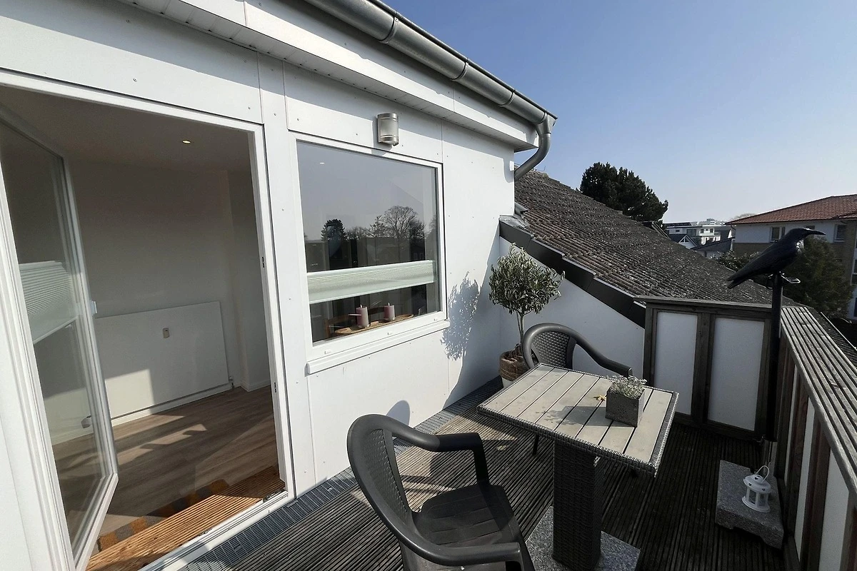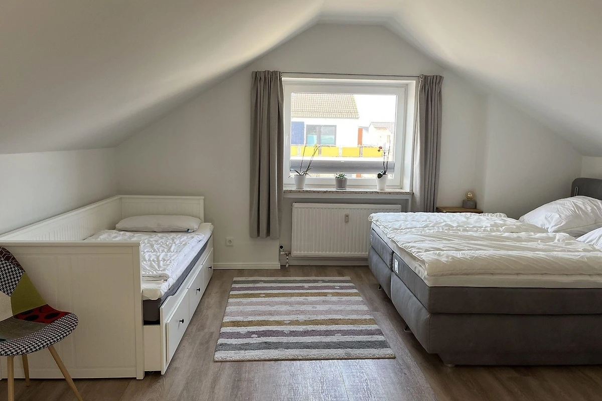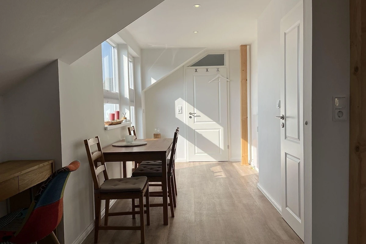 Die moderne 75 m² grosse Ferienwohnung "Sonnendeck" im 2. Obergeschoss bietet Platz für maximal 4 Personen. Das Wohnzimmer ist mit einem TV, einer Chaiselongue-Couch sowie einem gemütlichen Ohrensessel ausgestattet. Ein integrierter Essplatz für 4 Personen und ein zusätzliches Kojenbett schaffen Komfort. Die angrenzende Küche verfügt über einen Geschirrspüler, einen Mini-Backofen mit Grillfunktion, eine Mikrowelle und einen Induktionsherd mit 2 Platten. Ein Schlafzimmer mit einem Doppelbett (zwei Einzelmatratzen) und einem Kojenbett, sowie zwei tageslichthelle Badezimmer mit Dusche, WC und Waschtisch runden die Wohnung ab. Eine Waschmaschine und ein Trockner stehen zur gemeinschaftlichen Nutzung im Keller bereit (gebührenpflichtig). Haustiere sind nicht erlaubt. Ein PKW-Stellplatz befindet sich direkt vor dem Haus.