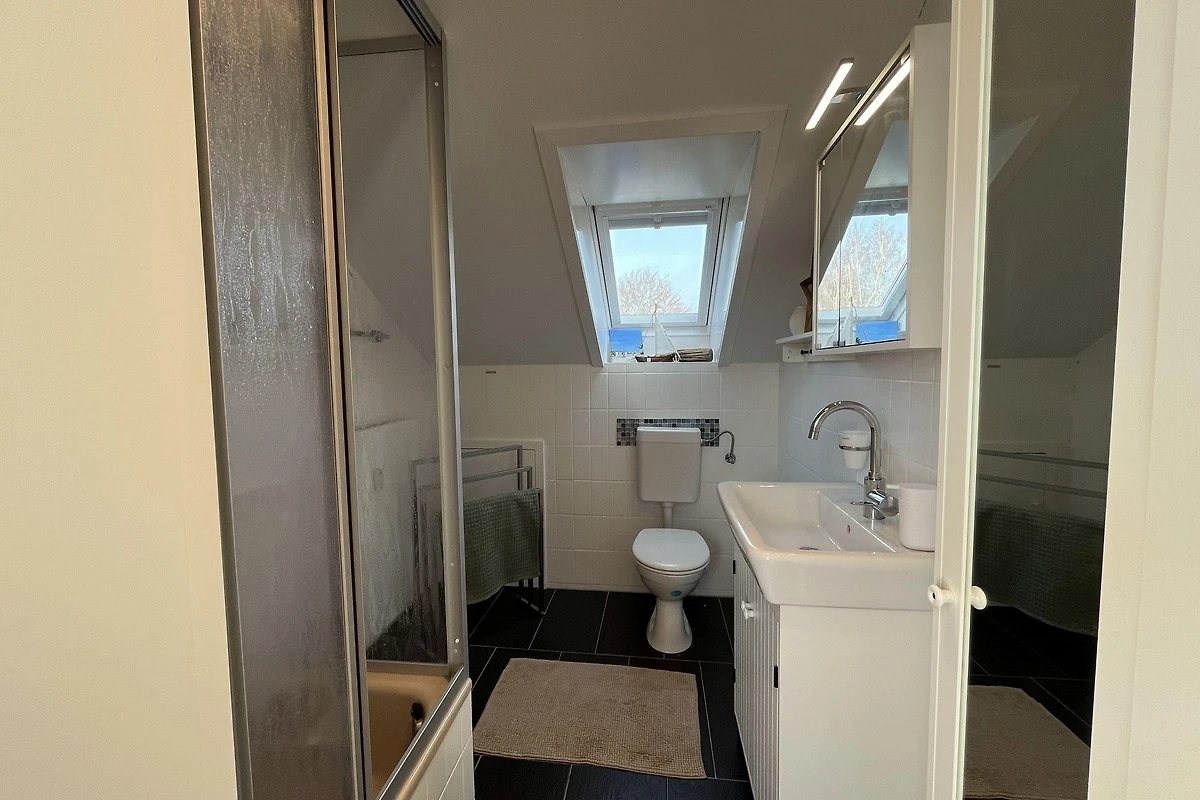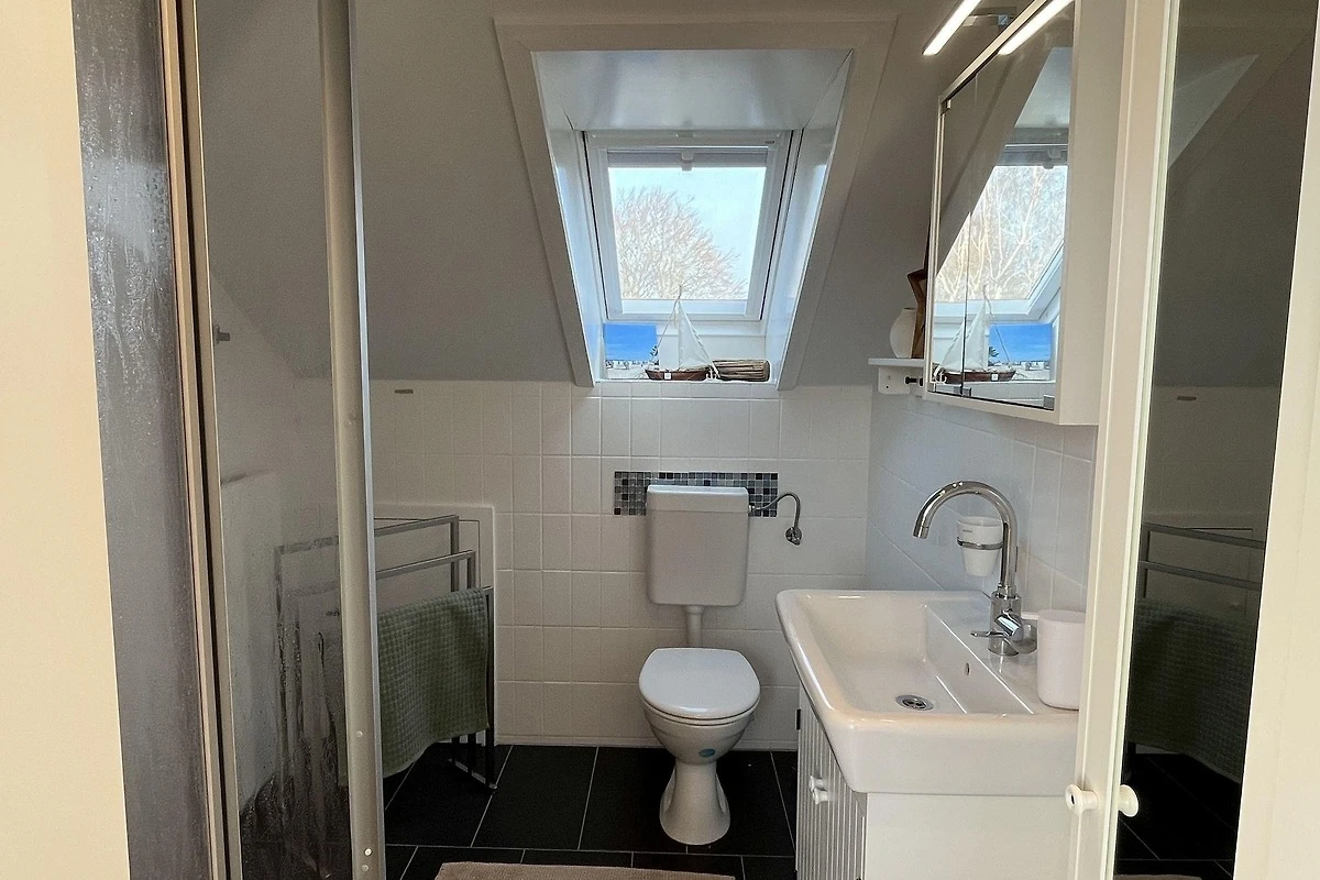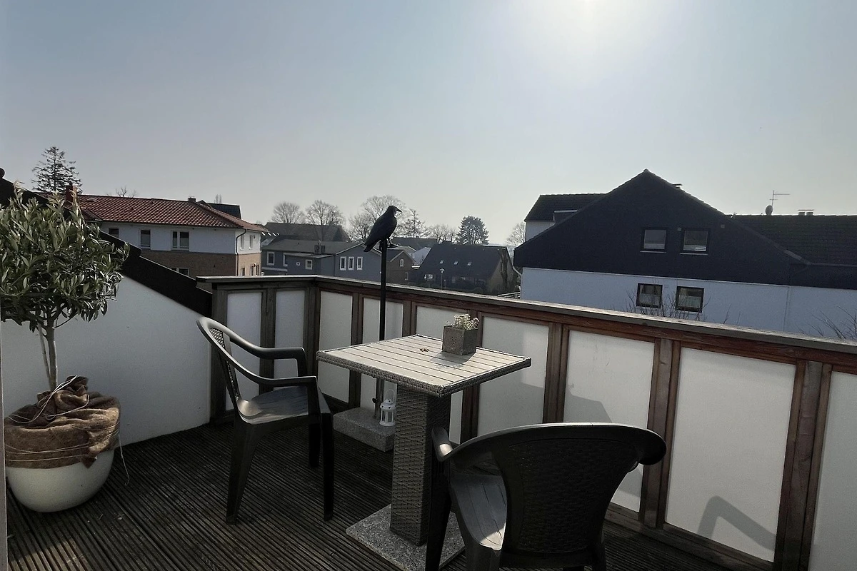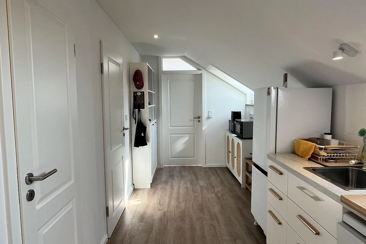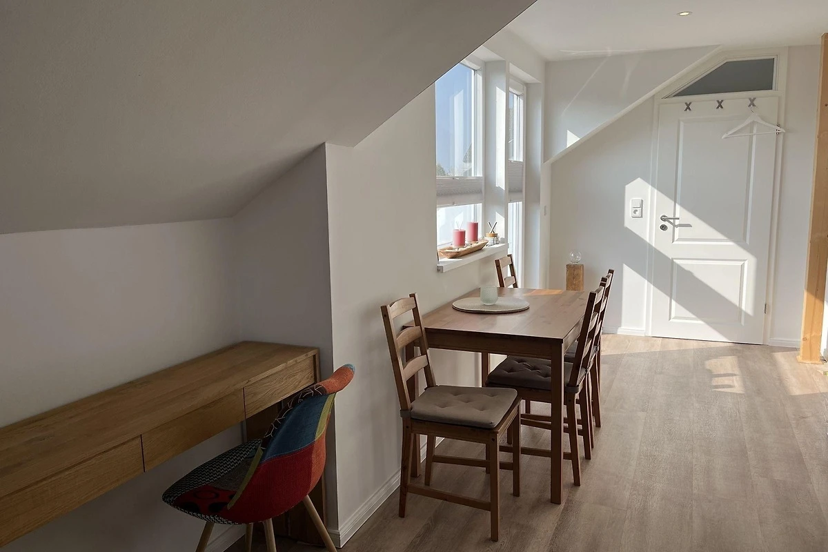 Die moderne 75 m² grosse Ferienwohnung "Sonnendeck" im 2. Obergeschoss bietet Platz für maximal 4 Personen. Das Wohnzimmer ist mit einem TV, einer Chaiselongue-Couch sowie einem gemütlichen Ohrensessel ausgestattet. Ein integrierter Essplatz für 4 Personen und ein zusätzliches Kojenbett schaffen Komfort. Die angrenzende Küche verfügt über einen Geschirrspüler, einen Mini-Backofen mit Grillfunktion, eine Mikrowelle und einen Induktionsherd mit 2 Platten. Ein Schlafzimmer mit einem Doppelbett (zwei Einzelmatratzen) und einem Kojenbett, sowie zwei tageslichthelle Badezimmer mit Dusche, WC und Waschtisch runden die Wohnung ab. Eine Waschmaschine und ein Trockner stehen zur gemeinschaftlichen Nutzung im Keller bereit (gebührenpflichtig). Haustiere sind nicht erlaubt. Ein PKW-Stellplatz befindet sich direkt vor dem Haus.