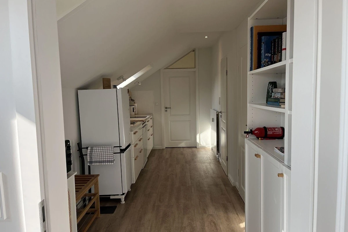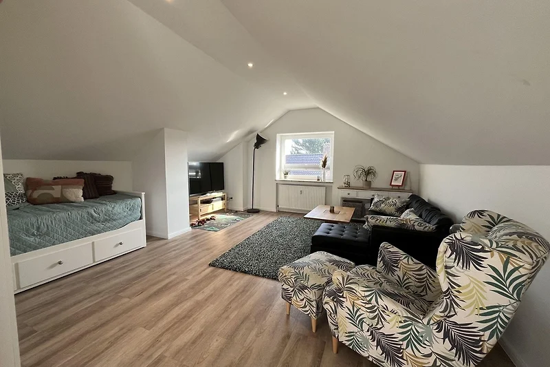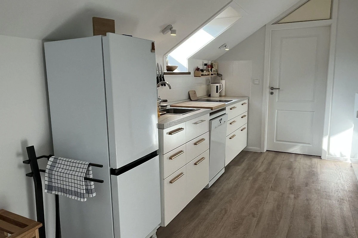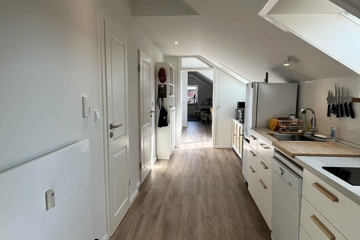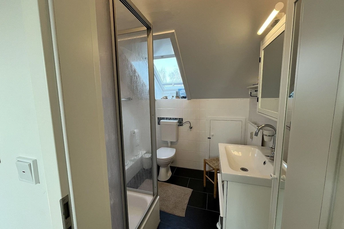 Die moderne 75 m² grosse Ferienwohnung "Sonnendeck" im 2. Obergeschoss bietet Platz für maximal 4 Personen. Das Wohnzimmer ist mit einem TV, einer Chaiselongue-Couch sowie einem gemütlichen Ohrensessel ausgestattet. Ein integrierter Essplatz für 4 Personen und ein zusätzliches Kojenbett schaffen Komfort. Die angrenzende Küche verfügt über einen Geschirrspüler, einen Mini-Backofen mit Grillfunktion, eine Mikrowelle und einen Induktionsherd mit 2 Platten. Ein Schlafzimmer mit einem Doppelbett (zwei Einzelmatratzen) und einem Kojenbett, sowie zwei tageslichthelle Badezimmer mit Dusche, WC und Waschtisch runden die Wohnung ab. Eine Waschmaschine und ein Trockner stehen zur gemeinschaftlichen Nutzung im Keller bereit (gebührenpflichtig). Haustiere sind nicht erlaubt. Ein PKW-Stellplatz befindet sich direkt vor dem Haus.