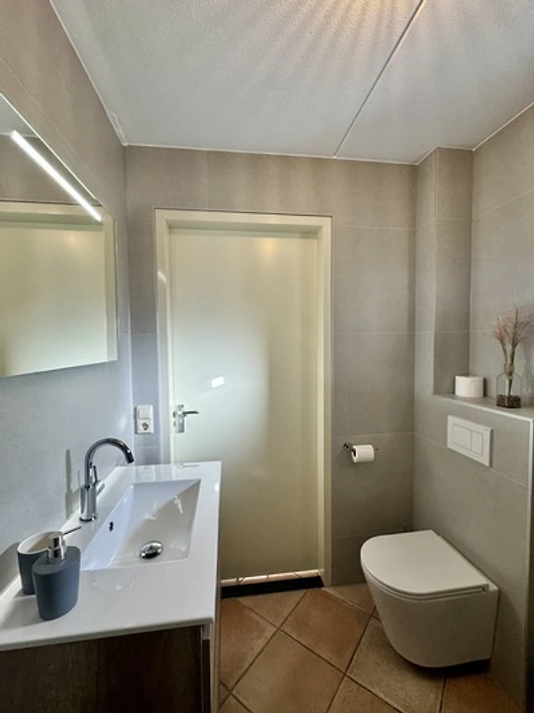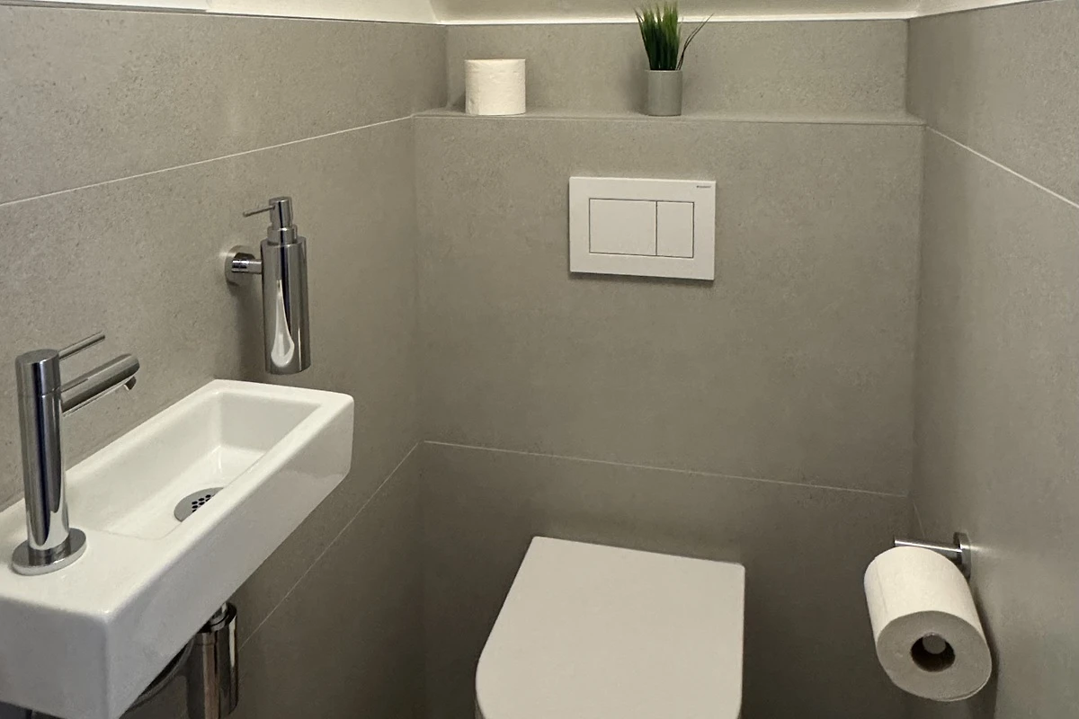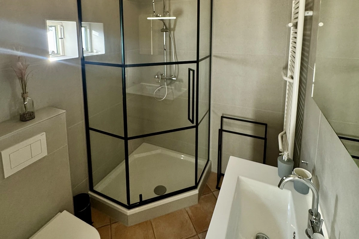 Das Badezimmer befindet sich ebenfalls im Erdgeschoss und ist mit Waschbecken, Dusche und Toilette ausgestattet. Das 2. W.C. finder man im 1. Stock
