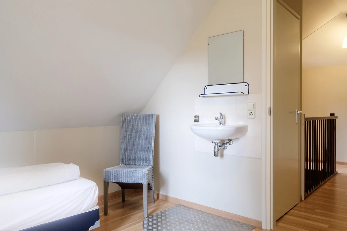 Im 1. Stock befinden sich zwei weitere geräumige Schlafzimmer. Ein Schlafzimmer ist ausgestattet mit Doppelbett (1.80x2.00) und 1 Schlafzimmer hat 2 Einzelbetten (90x2.00) und kleines Waschbecken. Alle Betten haben Einzelmatratzen und Einzel Bettdecken.