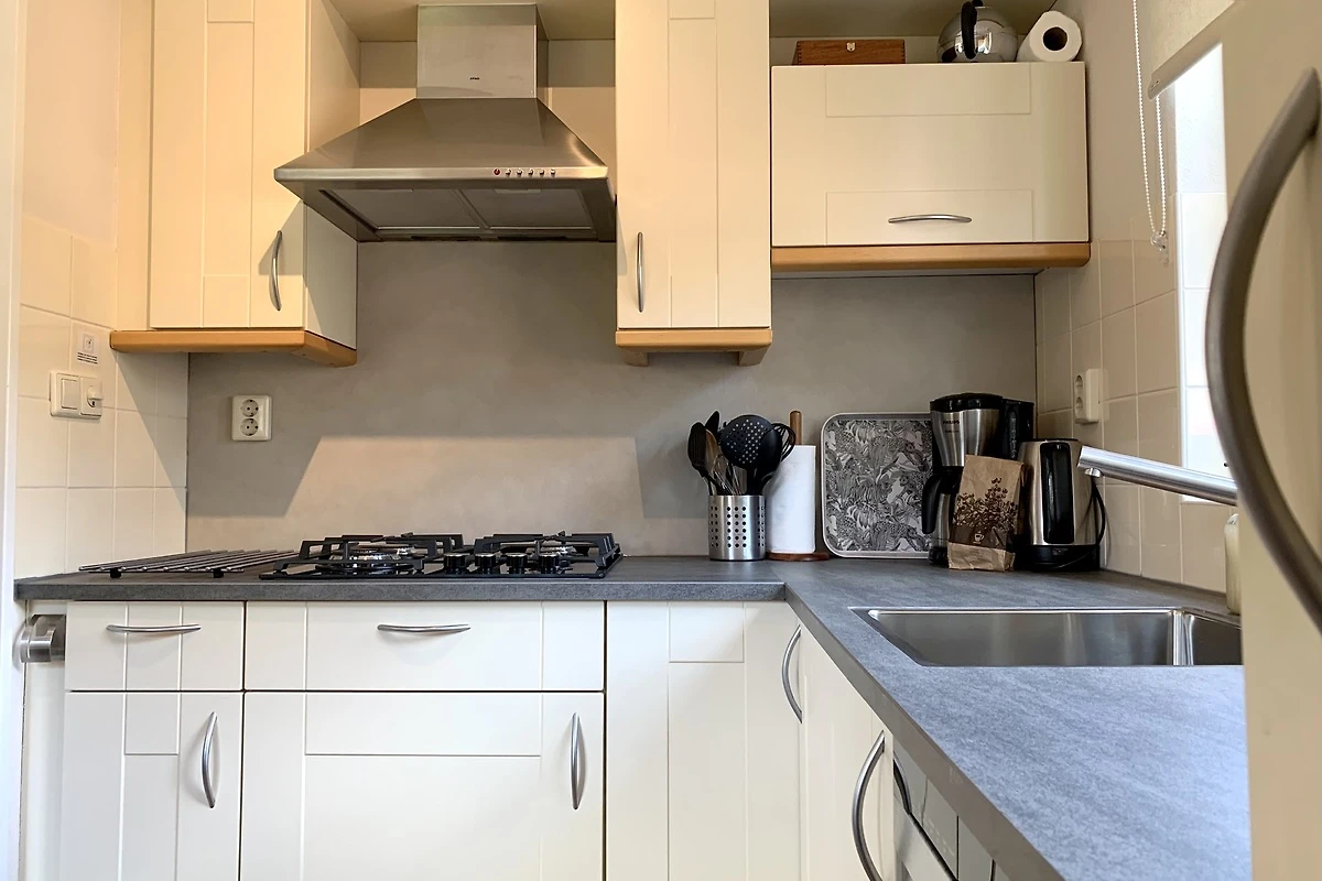 Die offene Küche ist komplett ausgestattet und verfügt über einen Geschirrspüler, Filterkaffeemaschine, 4-Flammen-gasherd uned Mikrowelle (inkl. Backofen) . Im Abstellraum stehen Ihnen sowohl eine Waschmaschine als auch ein Trockner zur Verfügung.