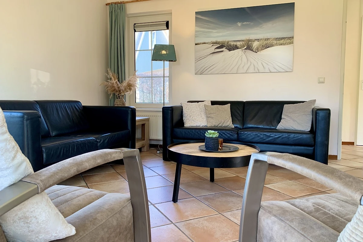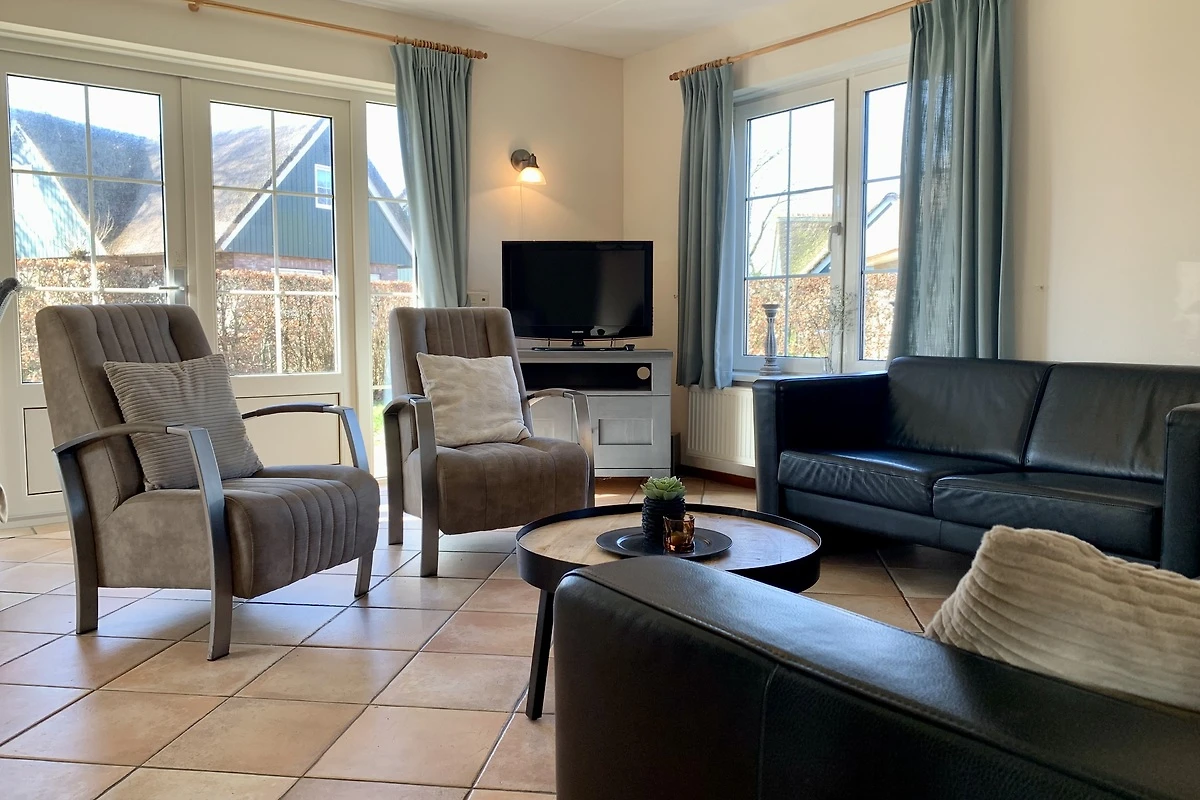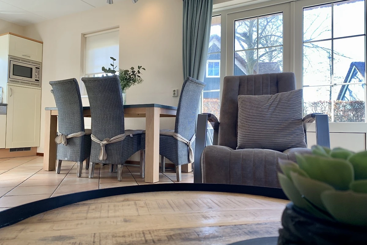 Das gut ausgestattete Wohnzimmer verfügt 2 bequeme Sofas und 1 Sesses. Es gibt ein Fernseher mit Kabel mit sowohl niederländischen als deutsche Programme. Das Esszimmer hat einen geräumigen Tisch mit 6 Stühlen. kinderstuhlt ist auch vorhanden.
