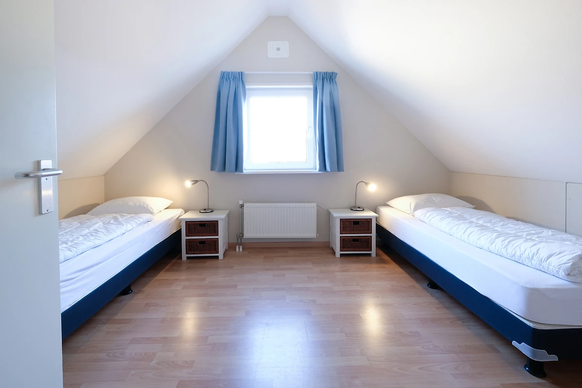 Im 1. Stock befinden sich zwei weitere geräumige Schlafzimmer. Ein Schlafzimmer ist ausgestattet mit einem Doppelbett (180x200) und das 2. Schlafzimmer hat zwei Einzelbetten (90x200) und einem kleinen Waschbecken. Alle Betten haben Einzelmatratzen und Einzelbettdecken.