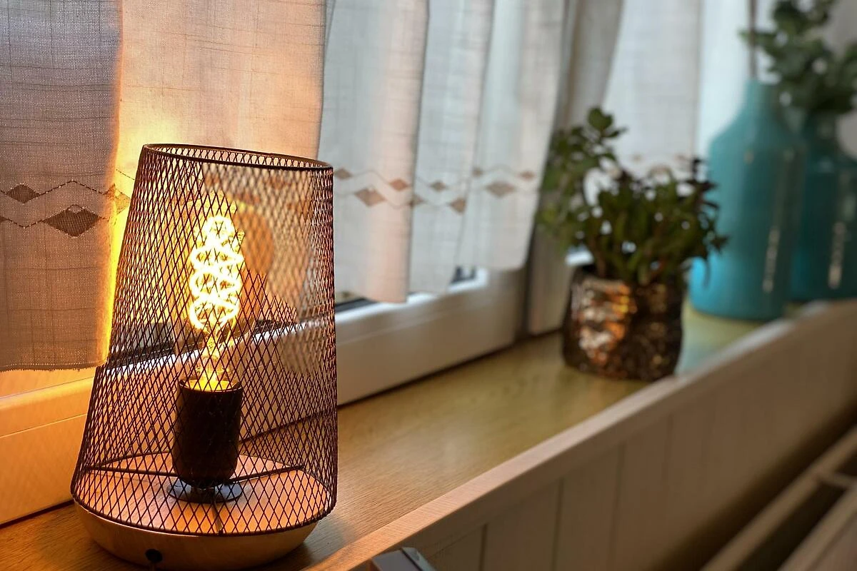 Im Erdgeschoss befindet sich ein Schlafzimmer mit einem Doppelbett (1,60) und zwei Einzelbettdecken.Vom Wohnzimmer aus gelangt man über die steile Wendeltreppe in den ersten Stock.