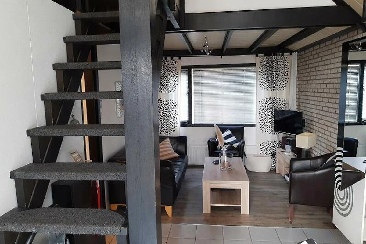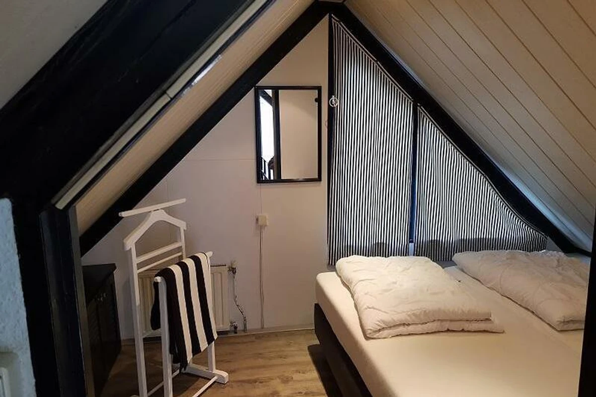 Vom Wohnzimmer aus erreichen Sie über eine Treppe den ersten Stock. Am oberen Ende der Treppe befindet sich ein Treppengitter.Im ersten Stock finden Sie das zweite Schlafzimmer mit Schrägdach, zu dem Sie über den Treppenabsatz gelangen. Auch hier gibt es ein Doppelbett mit Einzelbettdecken. Bettwäsche und Handtücher können über Great-Vakantiehuizen mieten. Auf dem Treppenabsatz gibt es Stauraum für Kleidung.
