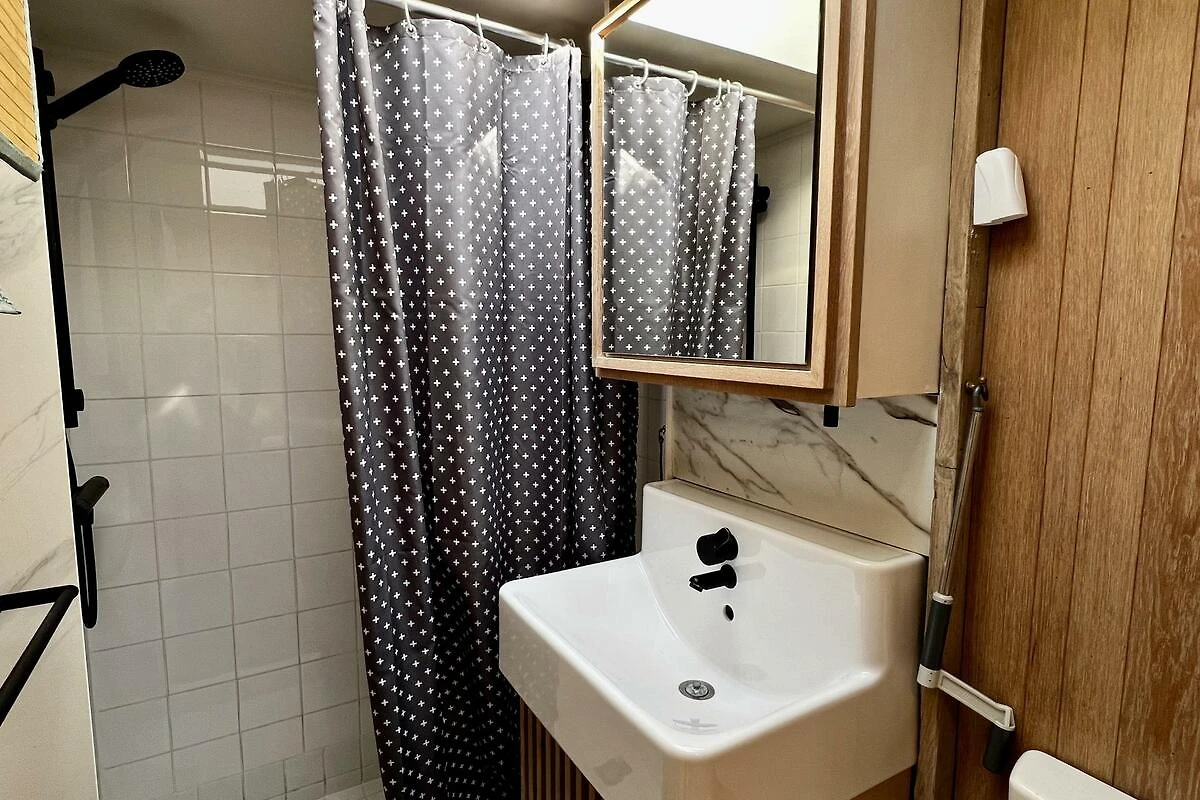 Bad-ToiletteDas Badezimmer hat eine Duschkabine und ein Waschbecken mit Spiegel. Die Toilette befindet sich ebenfalls im Badezimmer.