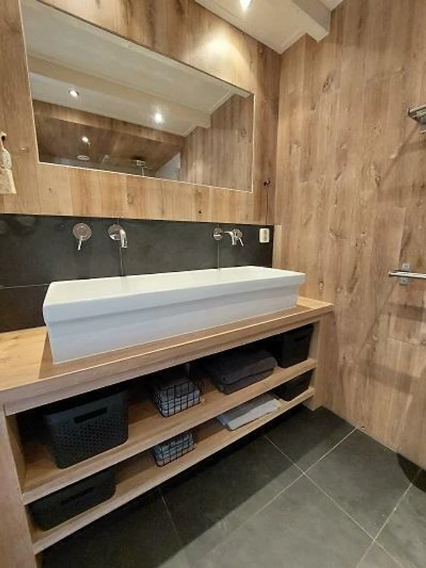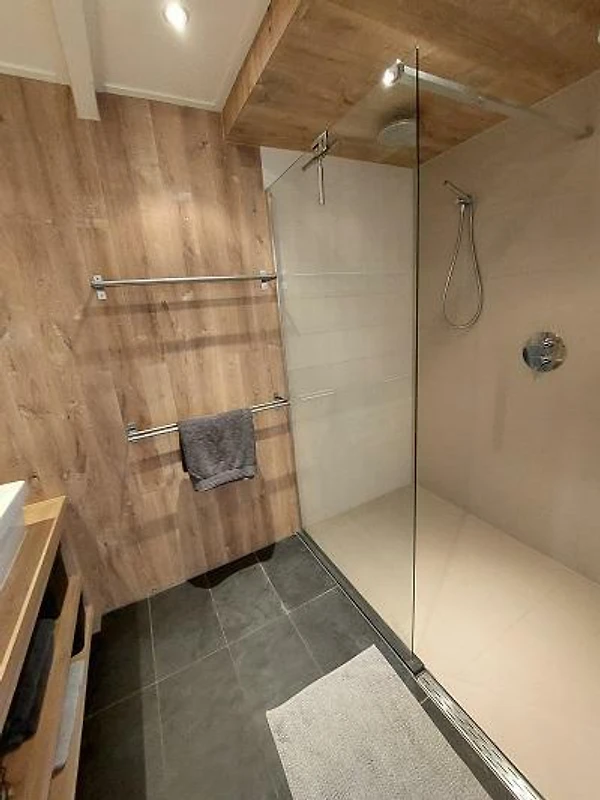 Das geräumige, moderne Badezimmer befindet sich im Erdgeschoss und verfügt über ein grosses Waschbecken und eine begehbare Dusche.