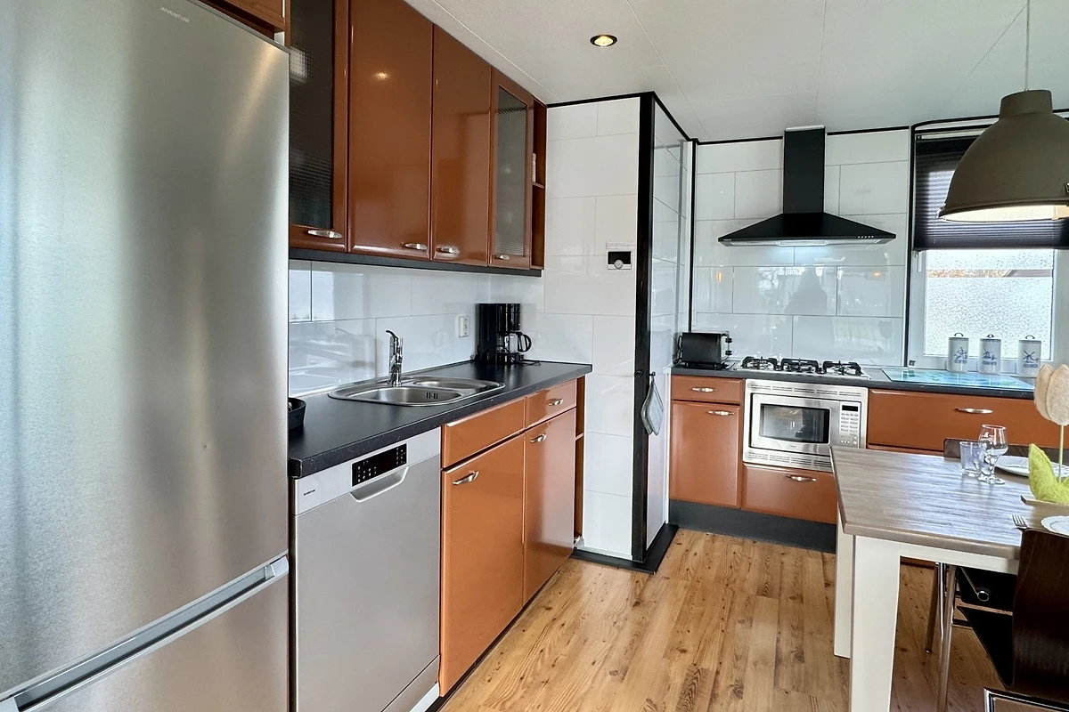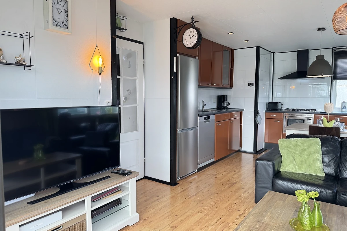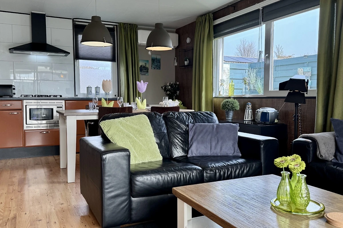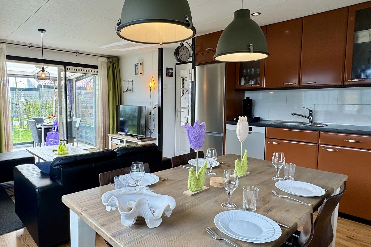Wohnzimmer und offene KücheDer Bungalow hat ein gemütliches Wohnzimmer mit 2 komfortablen Sofas und einem grossen Fernseher mit digitalem Empfang. Es gibt einen grossen Esstisch mit 4 Stühlen. Es ist auch ein Hochstuhl vorhanden. Die geräumige, offene Küche ist komplett ausgestattet mit einem 4-Flammen-Gasherd mit Dunstabzugshaube, Kaffeemaschine, Senseo-Kaffeemaschine, Wasserkocher, Kühl-/Gefrierschrank, Geschirrspüler, Backofen und Mikrowelle