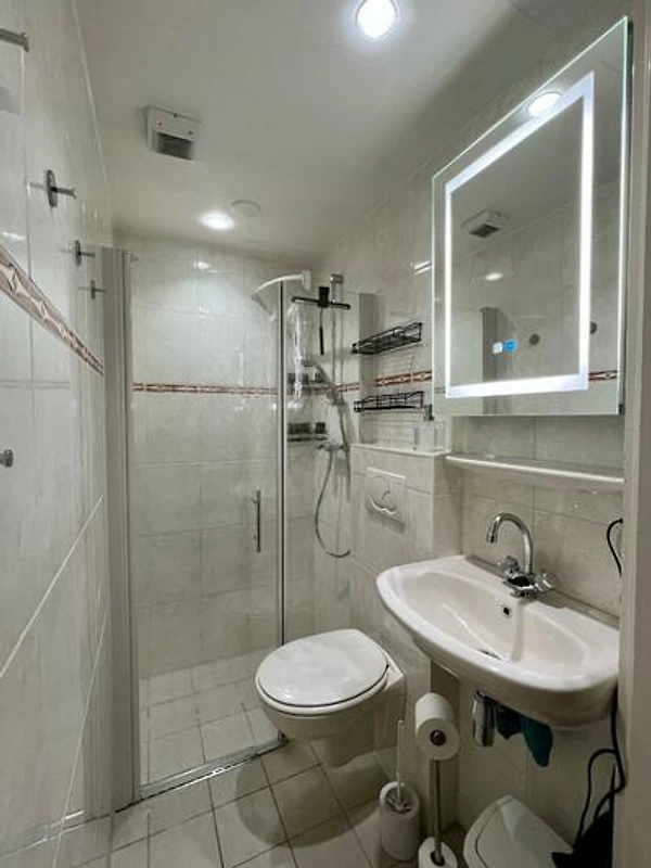 Badezimmer mit Dusche, Toilette und Waschbecken.