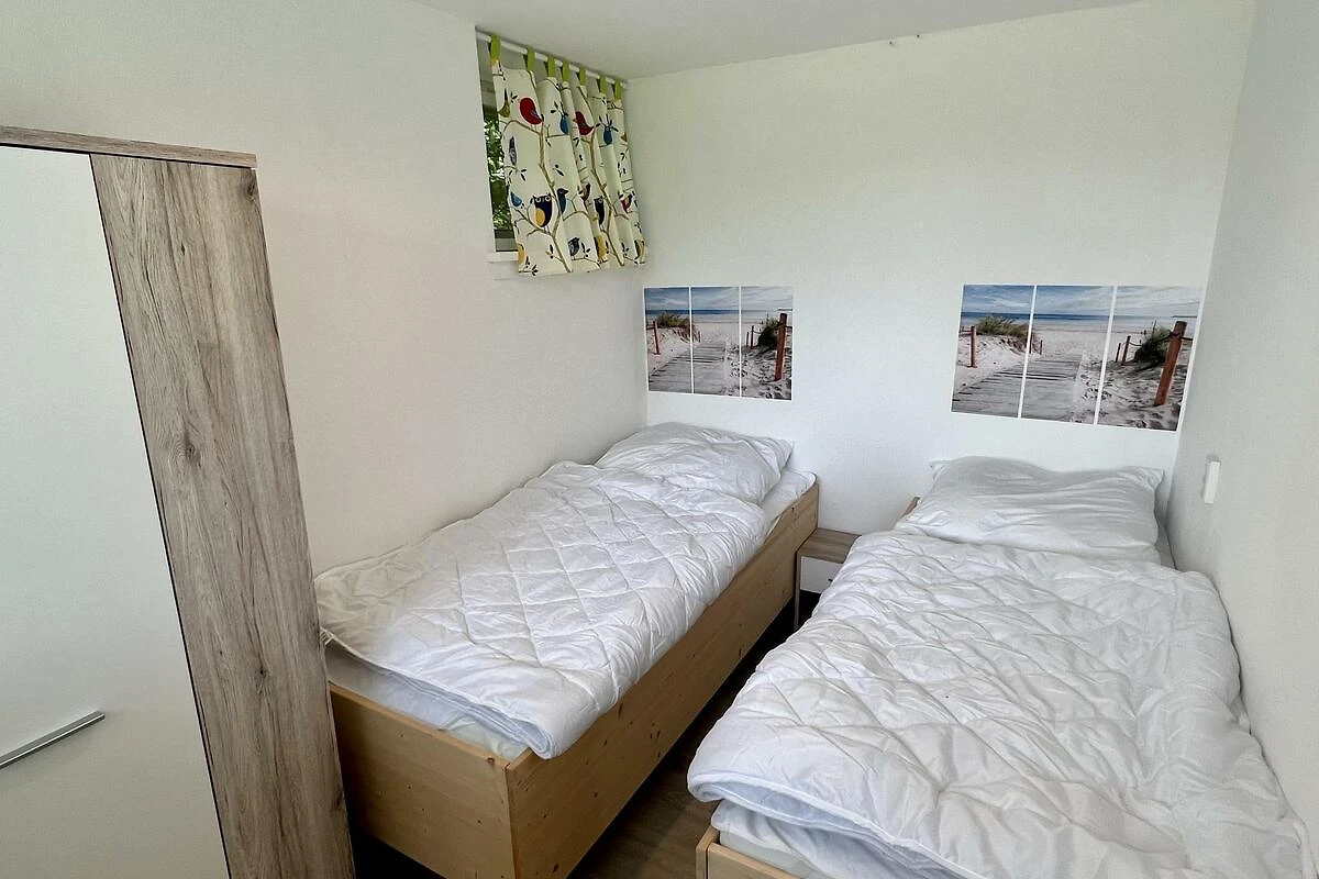 Es gibt drei Schlafzimmer. Das Schlafzimmer zur Gartenseite hat zwei Einzelbetten, das zweite Schlafzimmer hat ein Etagenbett und das dritte Schlafzimmer hat ein Einzelbett. Es gibt genügend Platz in den Schränken.