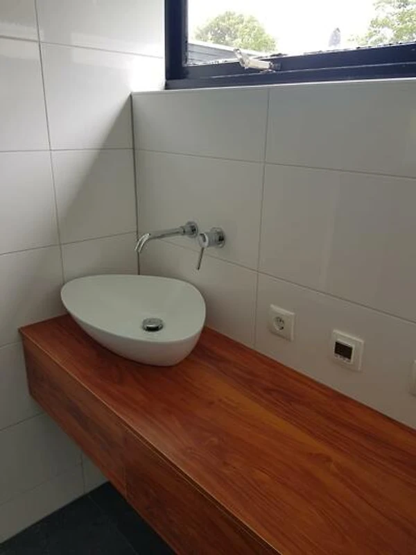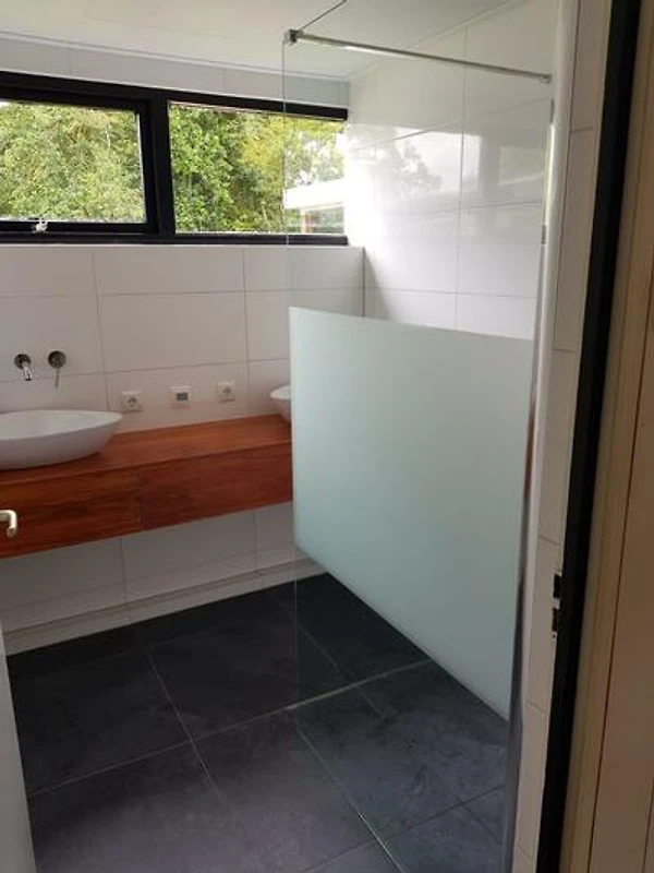 Badezimmer mit Dusche und Waschbecken. Die geräumige Toilette is separat.