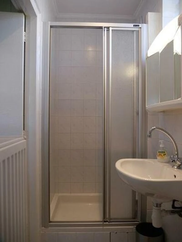 Das kleine Badezimmer ist mit einer Dusche mit Ablagemöglichkeiten, sowie einem WC und einem Waschbecken mit Spiegelschrank ausgestattet.Garten