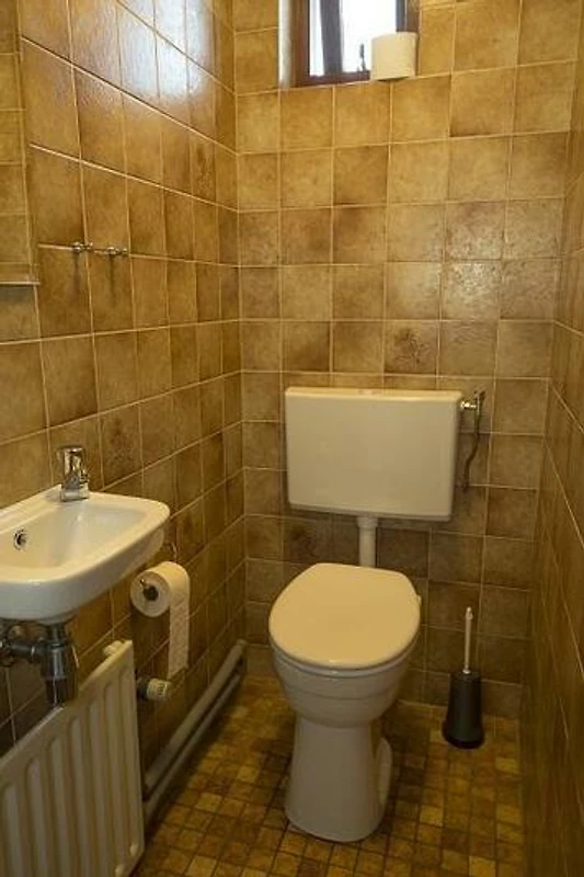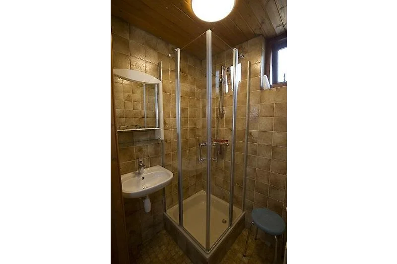 Entree, Badezimmer mit Duschkabine (75x75), Waschbecken, 220 Volt für Föhn- und Rasierapparat. Separate Toilette.
