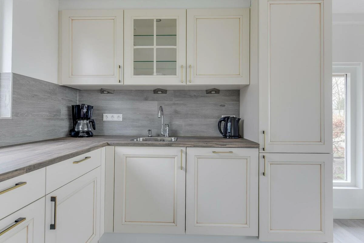Die offene Küche ist komplett ausgestattet und enthält einen Geschirrspüler, eine Filterkaffeemaschine, ein Induktionskochfeld und einen Backofen.