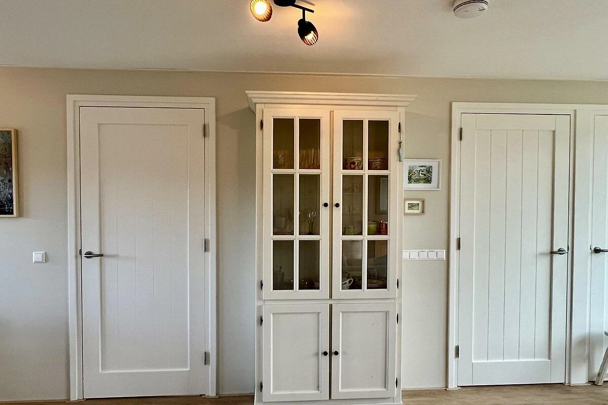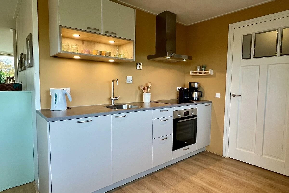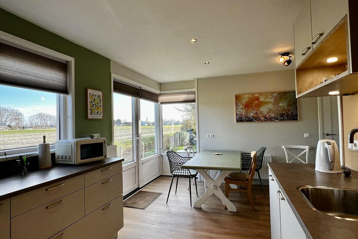 Das geräumige Wohnzimmer mit 3-Sitzer-Sofa, Sessel und Rattanmöbel ist lichtdurchflutet und hat ein Sonnenschutzglas auf der Südseite. Es ist mit einem PVC-Boden ausgestattet. Es gibt einen Smart-TV mit niederländischen und einigen deutschen TV-Kanälen. Die neue offene Küche ist komplett ausgestattet, darunter ein Induktionsherd mit Dunstabzugshaube, Geschirrspüler, Backofen und Mikrowelle sowie ein grosser Kühlschrank mit 3 Gefrierfächer. Zugleich steht eine neue Waschmaschine die Gäste zur Verfügung. Kaffeeliebhaber haben Auswahl zwischen einer Filterkaffeemaschine und einer Nespresso-Maschine. Vom Küchentisch aus haben Sie im Frühling einen schönen Blick auf die Blumenzwiebelfelder. Das Küchenfenster ist mit einem Mückengitter versehen.