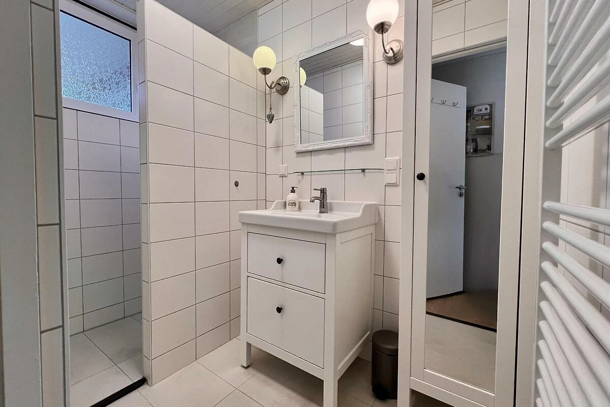 Es gibt ein komplett renoviertes Badezimmer mit einer Walk-in-Dusche und einem Waschbecken mit Spiegel. Die Toilette ist separat.