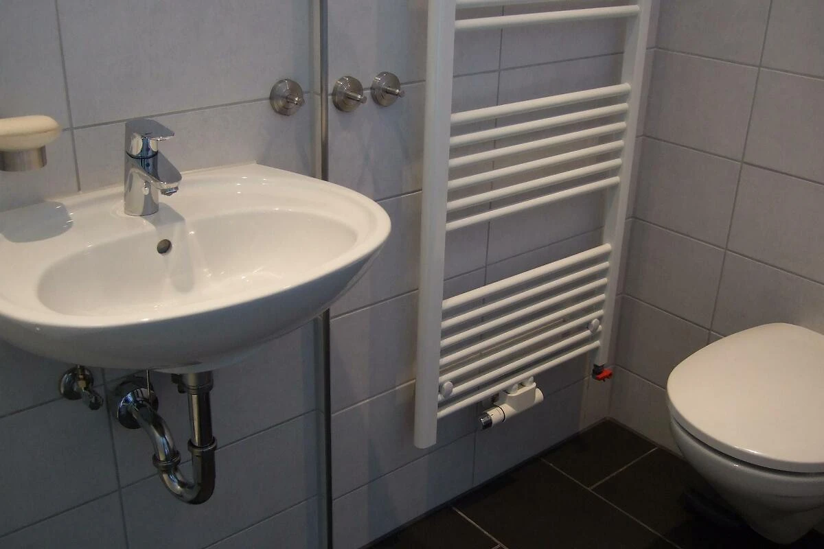 Das Badezimmer ist nicht sehr gross, aber modern, mit Duschkabine, Waschbecken mit Spiegel und Toilette.