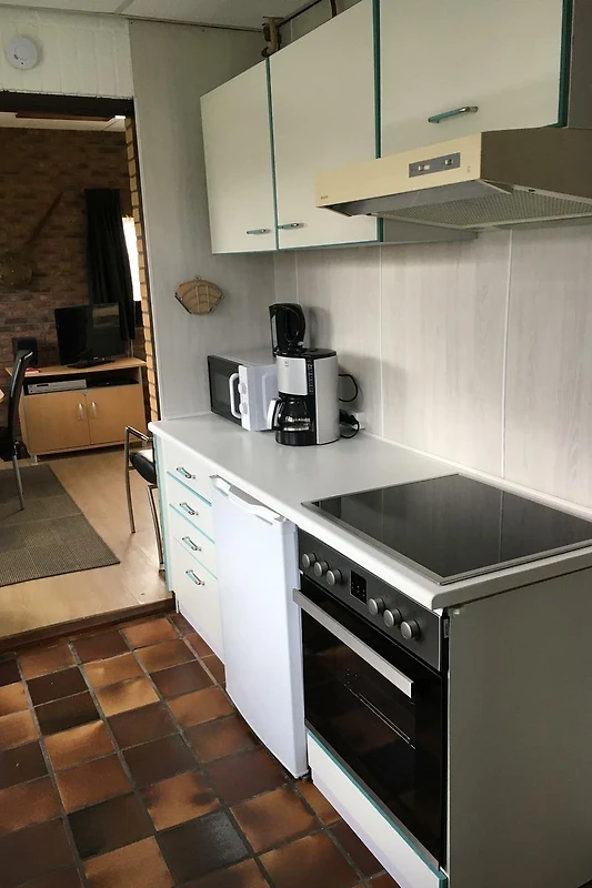 Die Küche ist mit einem Cerankochfeld mit Backofen und Dunstabzug ausgestattet. Es gibt einen Kühlschrank mit Gefrierfach, eine Mikrowelle und eine Filterkaffeemaschine.