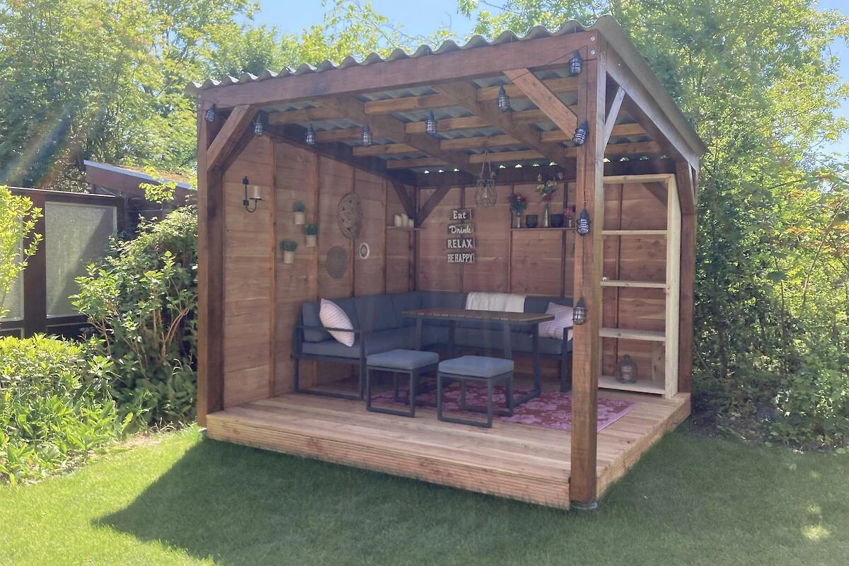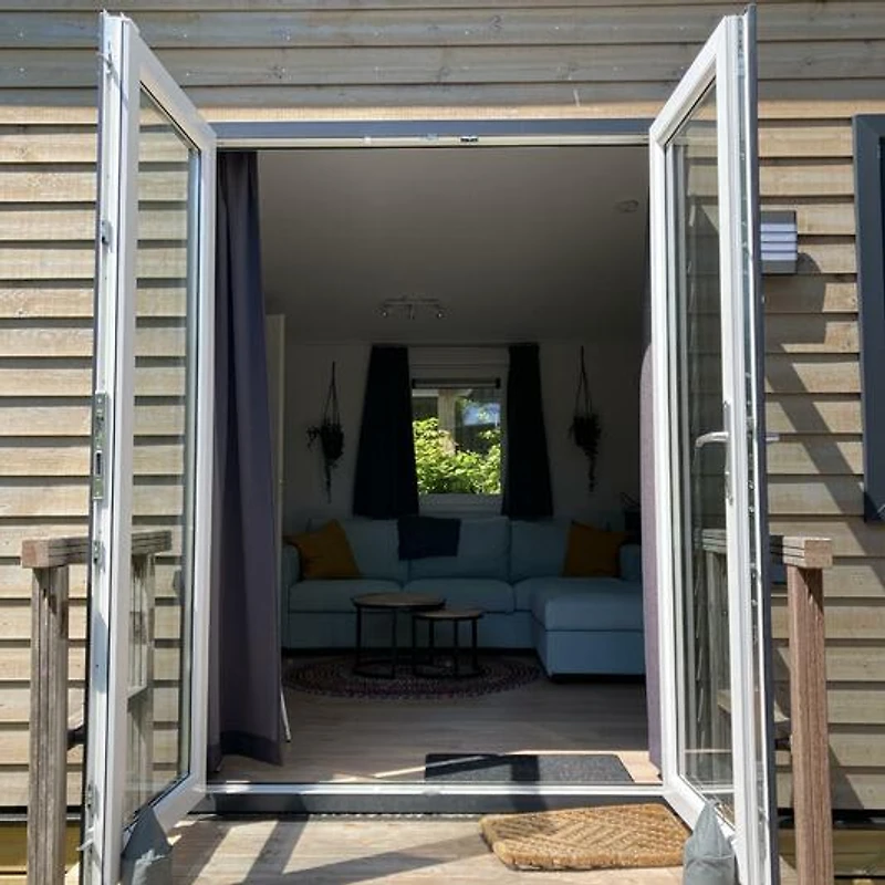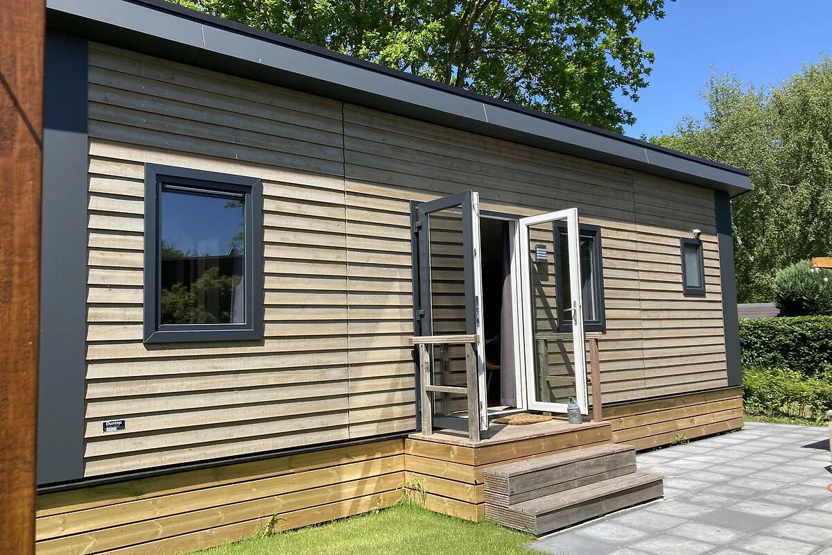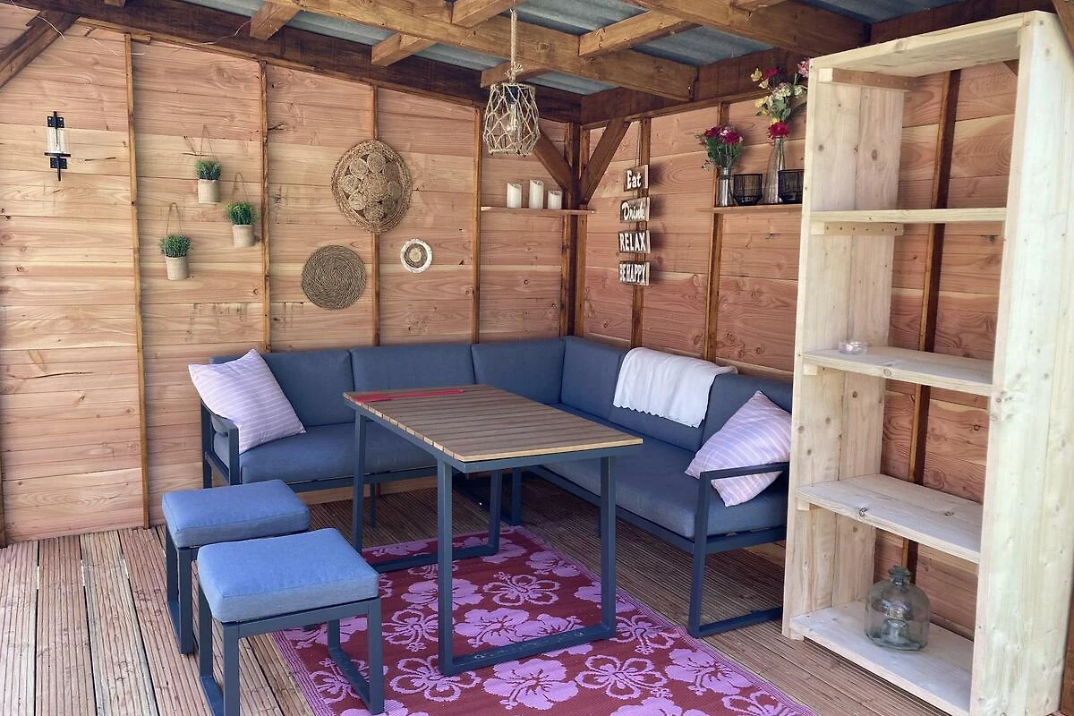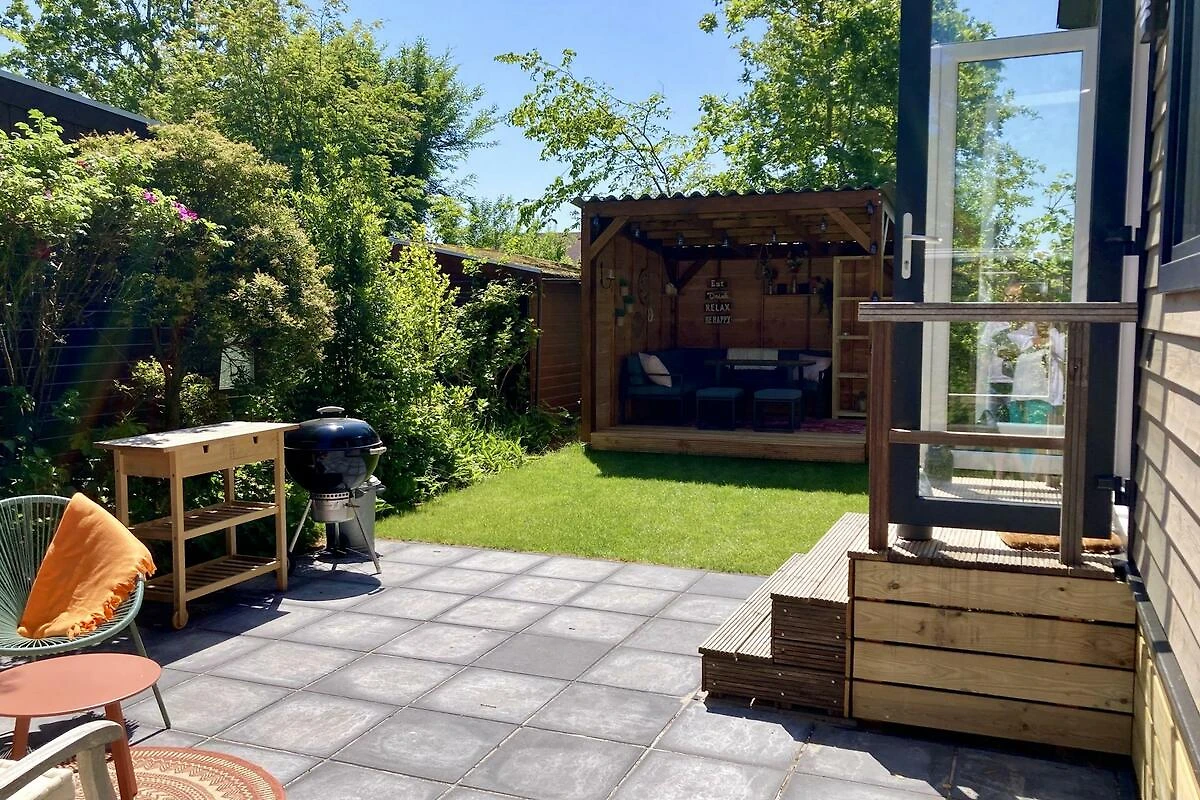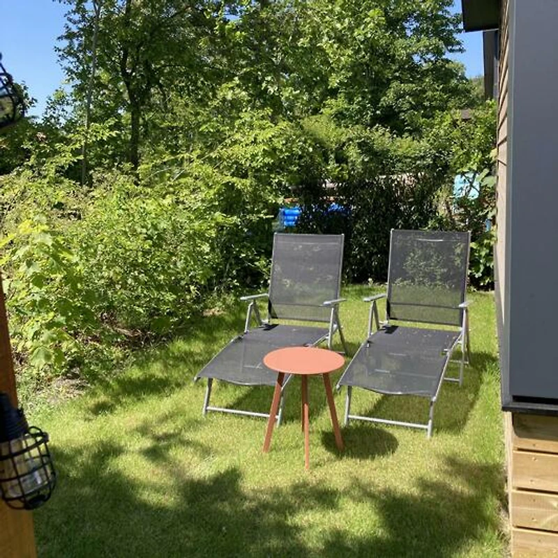 Vom Chalet aus gelangen Sie direkt auf die Terrasse. Der schöne Garten (100 m2) mit gefliester Terrasse und Rasenfläche verfügt über eine schöne freistehende Überdachung mit bequemer Lounge-Set, wo Sie bis spät und auch bei kühlerem Wetter verbringen können. Auf der Terrasse gibt es auch zwei Sonnenliegen und eine gemütliche Sitzecke.