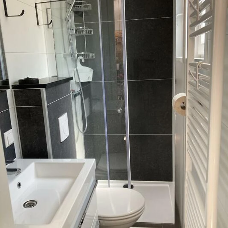 Das Badezimmer ist klein, aber modern, mit einer Duschkabine und einem Waschbecken mit Spiegel. Die Toilette befindet sich ebenfalls im Badezimmer.