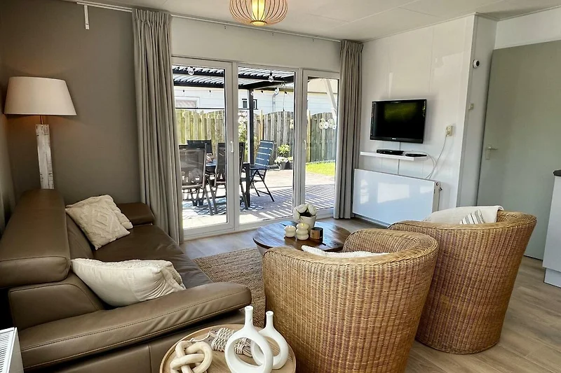 Das sonnige Wohnzimmer ist mit einer gemütlichen Sitzecke, einem Fernseher (digital) mit niederländischen und deutschen Fernsehprogrammen und einer HiFi-Anlage ausgestattet. Die helle, moderne offene Küche ist mit Geschirrspüler, Kaffeemaschine, Wasserkocher, Toaster, Kombi-Mikrowelle, Kühlschrank mit Gefrierfach, Dunstabzugshaube und 4-Flammen-Gasherd ausgestattet.