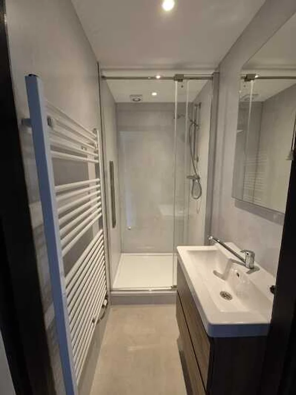 Die Wohnung verfügt über ein Bad mit Duschkabine (2025 neu) und Waschbecken mit Spiegel. Die Toilette befindet sich separat auf dem Flur.