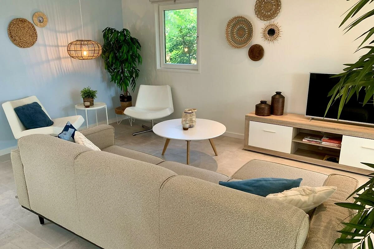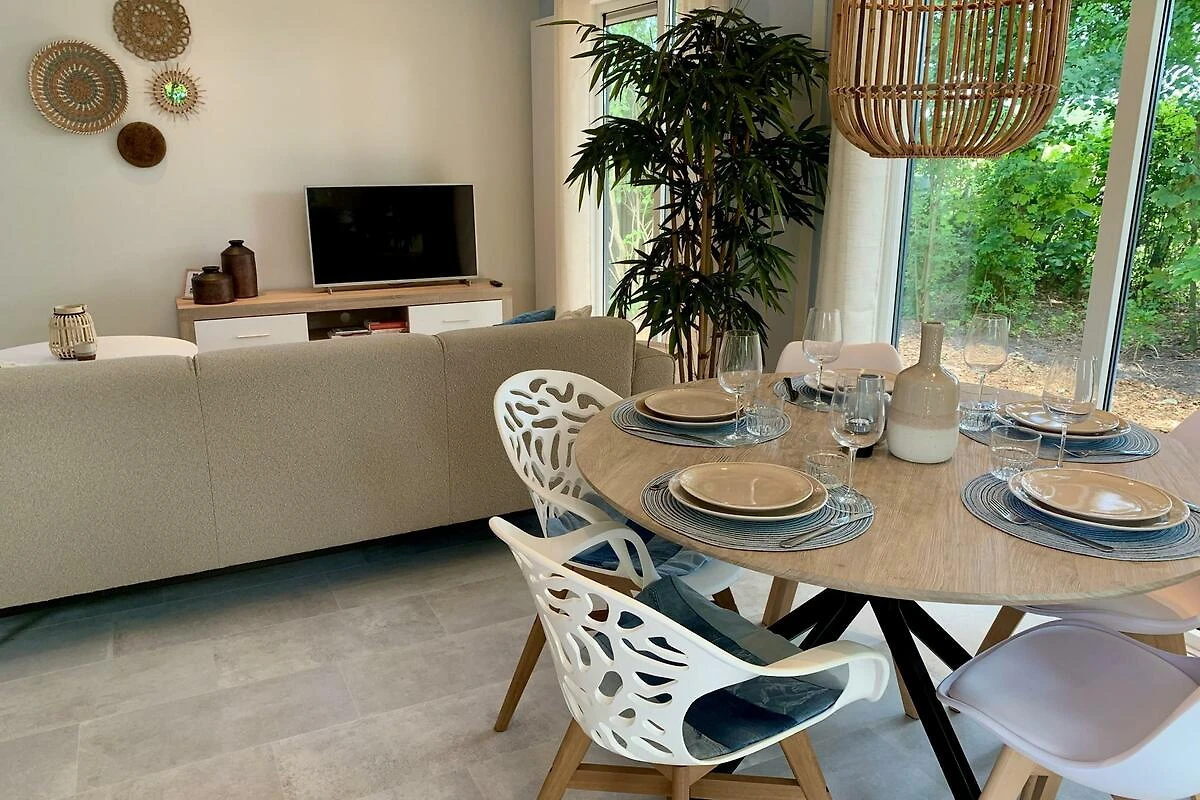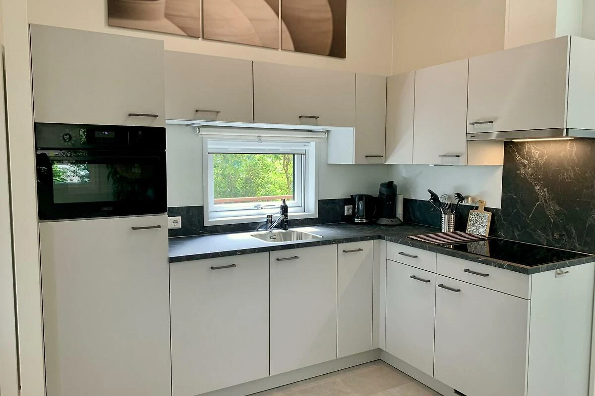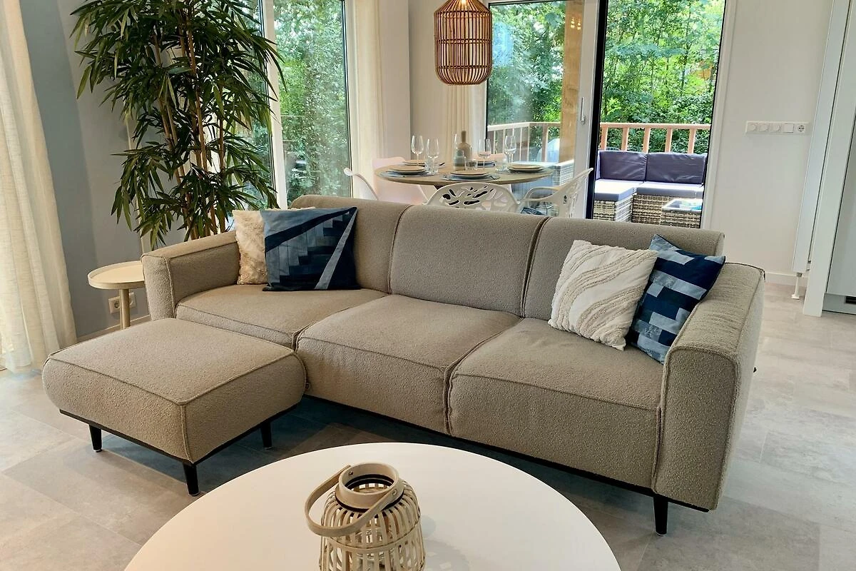 Das gartenorientierte Wohnzimmer ist wunderbar geräumig und modern, mit einem 3-Sitzer-Sofa und 2 trendigen Drehsesseln, Smart TV mit niederländischen und einigen deutschen Kanälen. Die Küche ist eine Eckküche, modern gestaltet und u.a. mit einem Induktionsherd mit Dunstabzugshaube, einer Kombi-Mikrowelle, einem Geschirrspüler und einem Kühlschrank mit Gefrierfach ausgestattet. Es gibt eine gemütliche Essecke mit rundem Tisch und 5 Stühlen.
