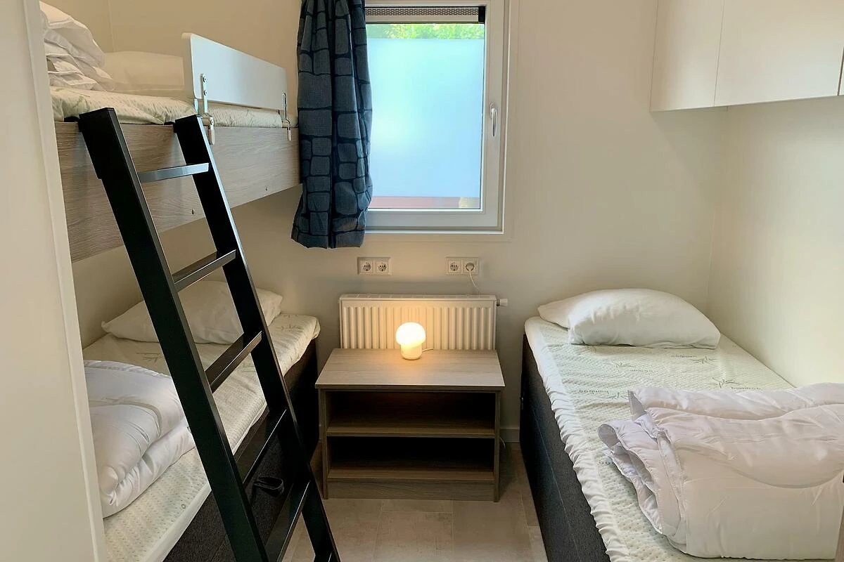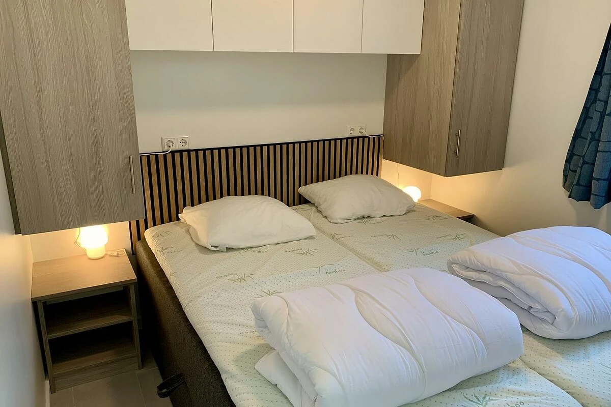 Es gibt 2 Schlafzimmer. Schlafzimmer 1 hat ein 2-Personen-Boxspringbett (2 separate 80 x 200cm Matratzen und 1-Personen-Bettdecken), Schlafzimmer 2 hat ein Etagenbett (unteres Bett ist ein Boxspringbett, oberes Bett hat einen Lattenrost) und ein 1-Personen-Boxspringbett (alle 80 x 200cm).