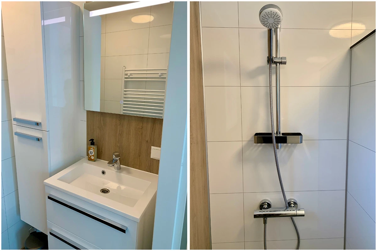 Das Badezimmer hat eine begehbare Dusche und ein Waschbecken mit beleuchtetem Spiegel und viel Schrankplatz. Die Toilette befindet sich in einem separaten Raum.