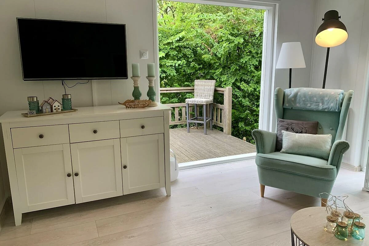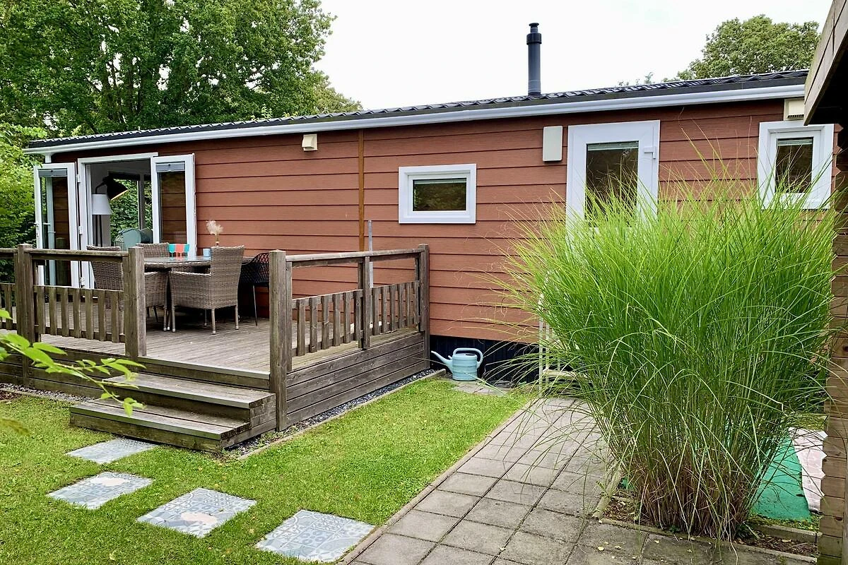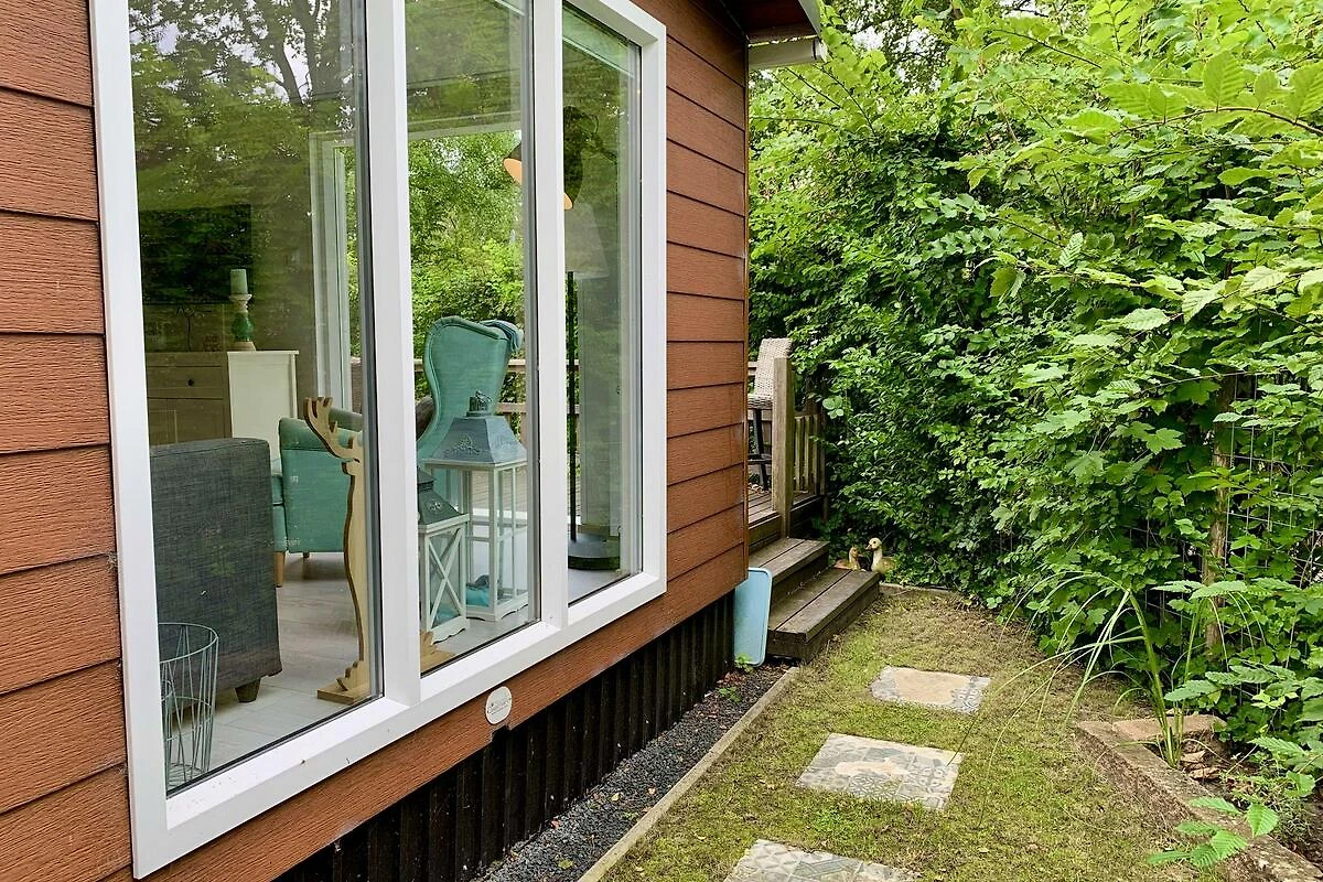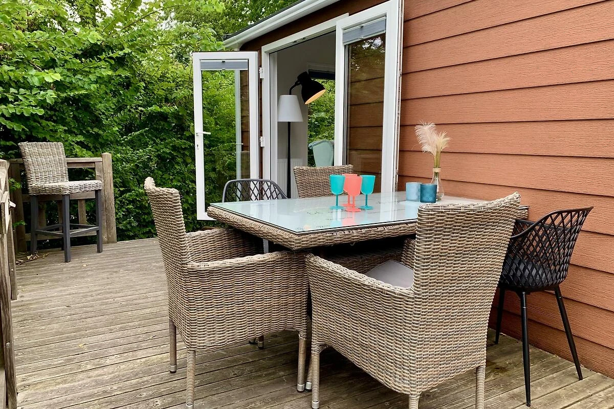 Es gibt eine erhöhte Terrasse mit Gartentisch und 6 Gartenstühlen und ein schönes, geschütztes Plätzchen im schönen Garten mit einem originalen, traditionellen Strandkorb, in dem Sie gemütlich sitzen können. Das Chalet liegt mitten im Park, umgeben von viel Grün. Der Garten ist vollständig eingezäunt. Es steht Ihnen ein Schuppen zur Verfügung, in dem unter anderem ein Bollerwagen zu finden ist.
