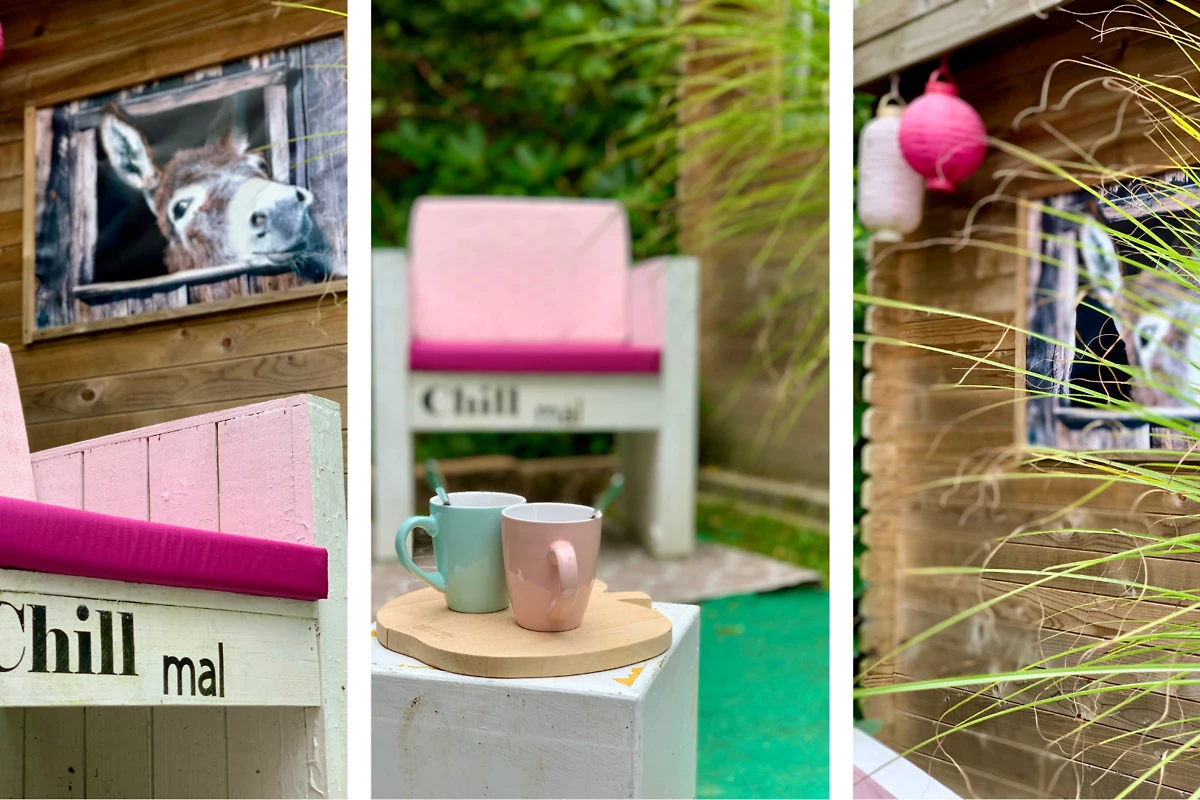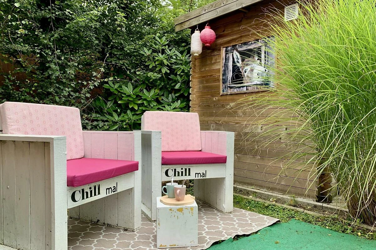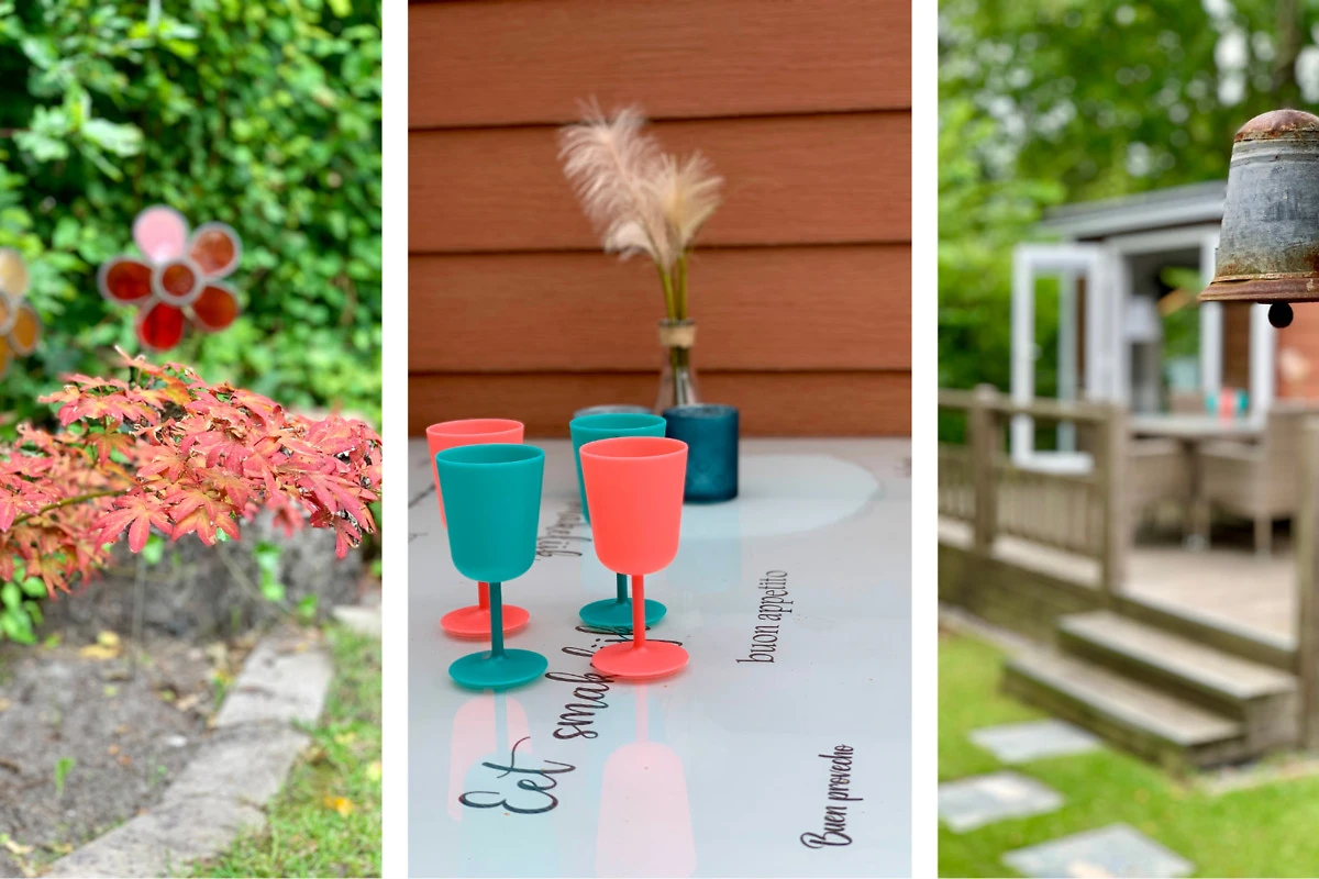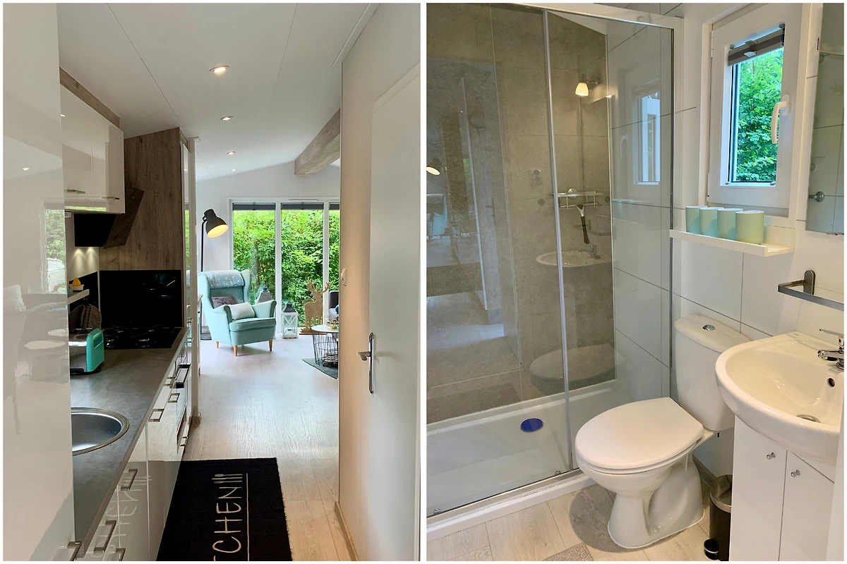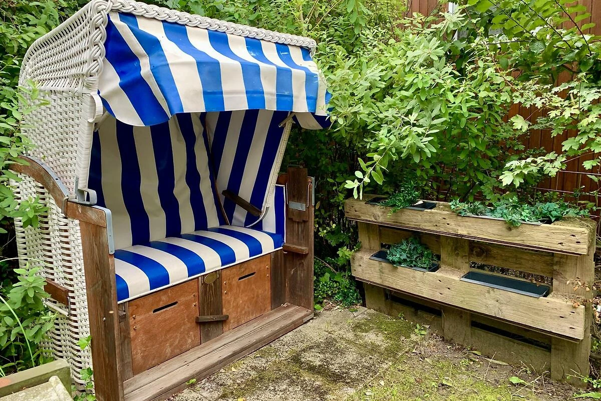 Es gibt eine erhöhte Terrasse mit Gartentisch und 6 Gartenstühlen und ein schönes, geschütztes Plätzchen im schönen Garten mit einem originalen, traditionellen Strandkorb, in dem Sie gemütlich sitzen können. Das Chalet liegt mitten im Park, umgeben von viel Grün. Der Garten ist vollständig eingezäunt. Es steht Ihnen ein Schuppen zur Verfügung, in dem unter anderem ein Bollerwagen zu finden ist.