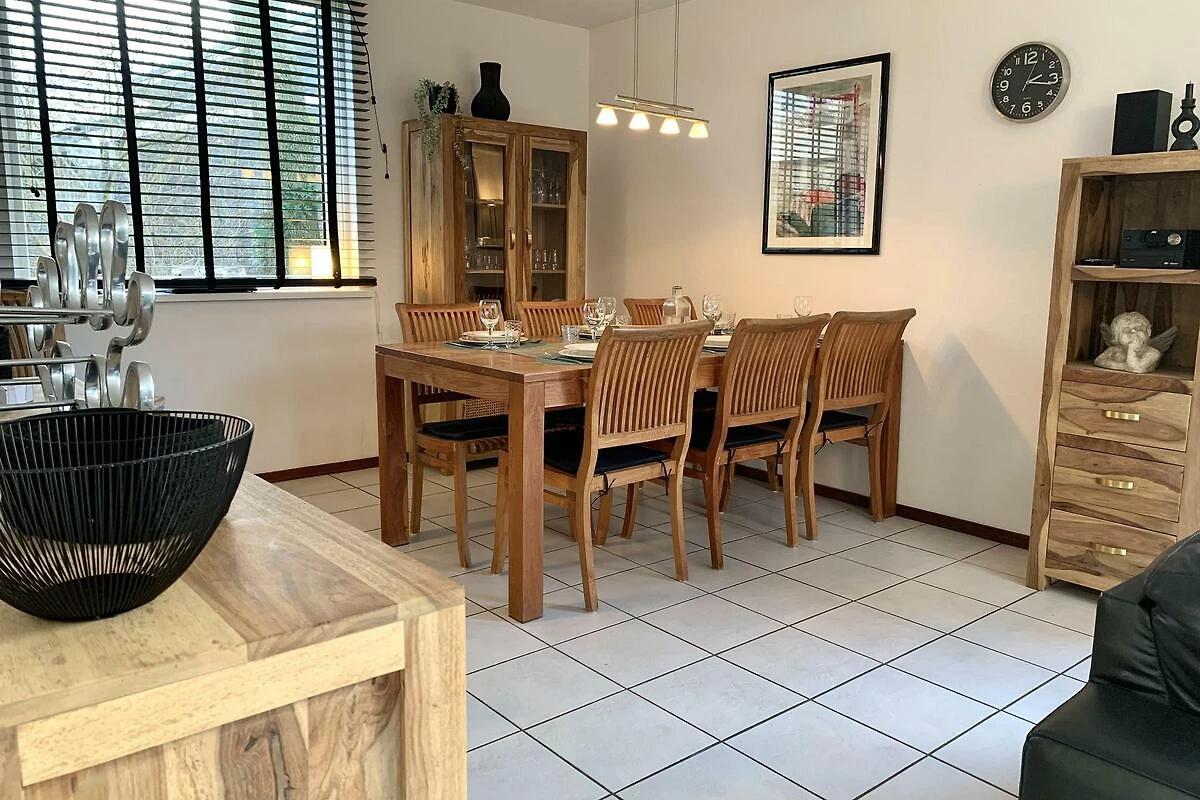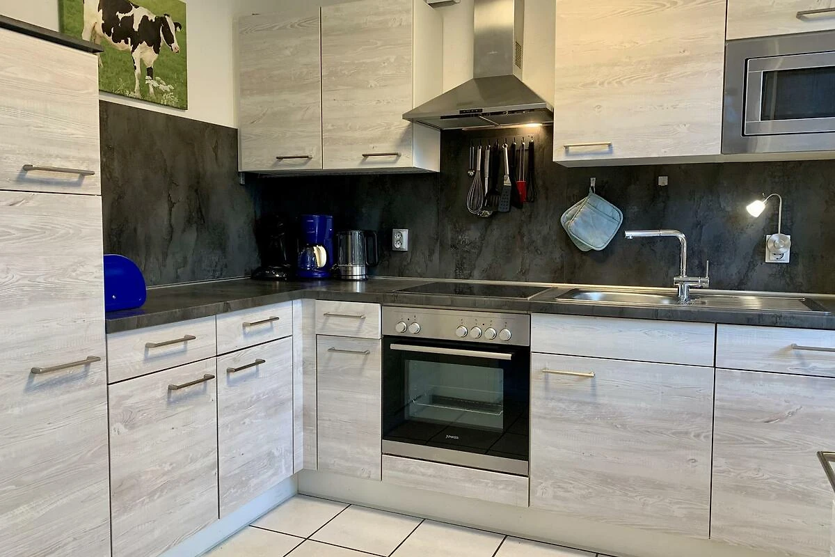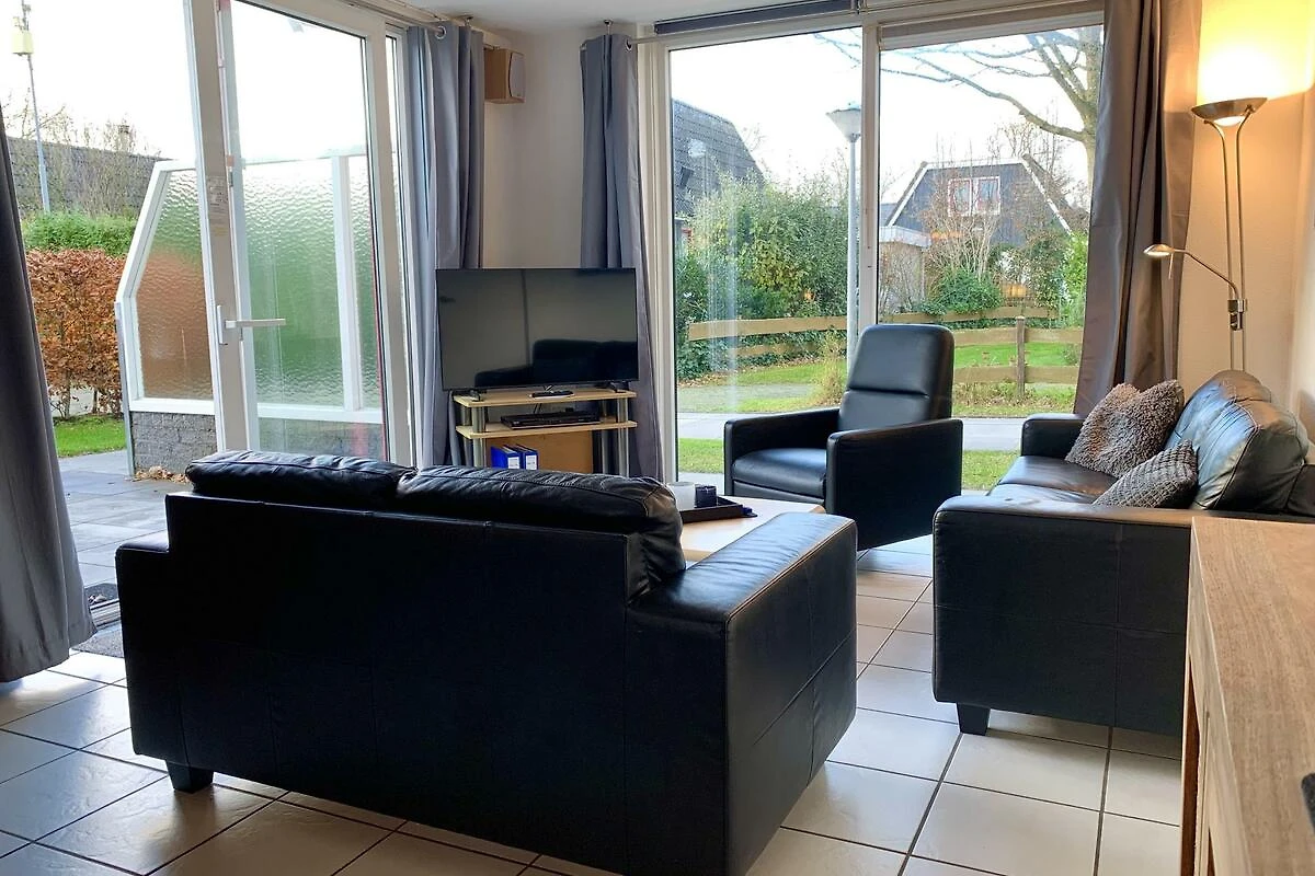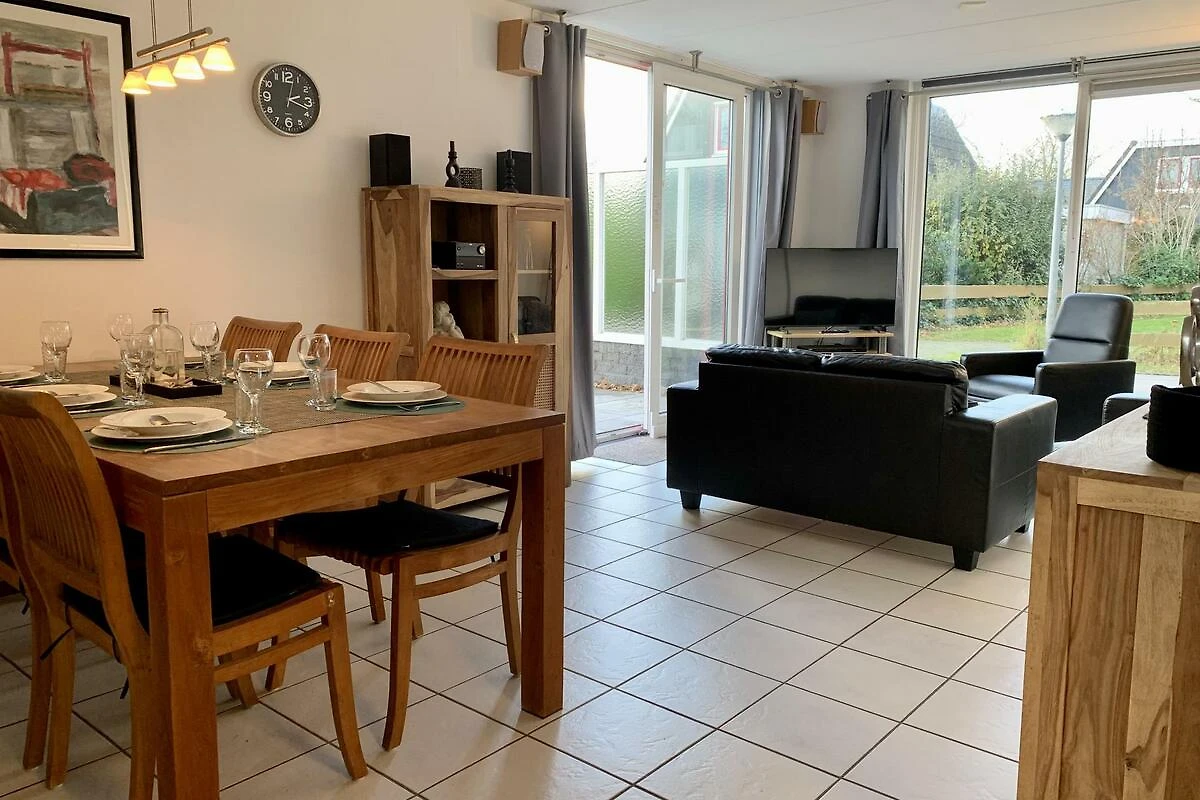 Im Erdgeschoss befindet sich ein geräumiges, gemütlich eingerichtetes Wohnzimmer mit grossen Fenstern. Es gibt eine gemütliche Sitzecke und einen Smart-TV mit niederländischen und deutschen Kanälen. Das ganze Haus ist gefliest und hat Fussbodenheizung. Die offene Küche ist u.a. mit Geschirrspüler, 4-Flammen-Herd, Kühlschrank mit Gefrierfach, Mikrowelle, Waffeleisen, Purrierstab und Mixer ausgestattet.