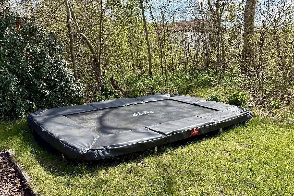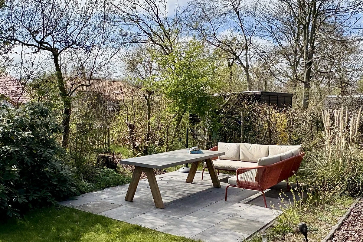Durch die Schiebetüren gelangen Sie auf die gemütliche Veranda mit Gartentisch, 4 Gartenstühlen und Loungesofa. Hier können Sie sich bei jedem Wetter im Freien aufhalten. Der Garten (95 m2) hat auch einen Rasen und ein Trampolin.
